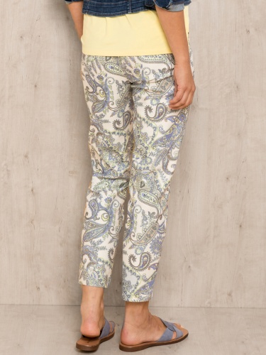 Укороченные брюки выполненные в узоре пейсли - яркий вариант низа на теплый сезон. Ткань из смесового льна приятна к телу и гарантирует долговечность изделия. Притачной пояс без шлевок, боковые карманы.