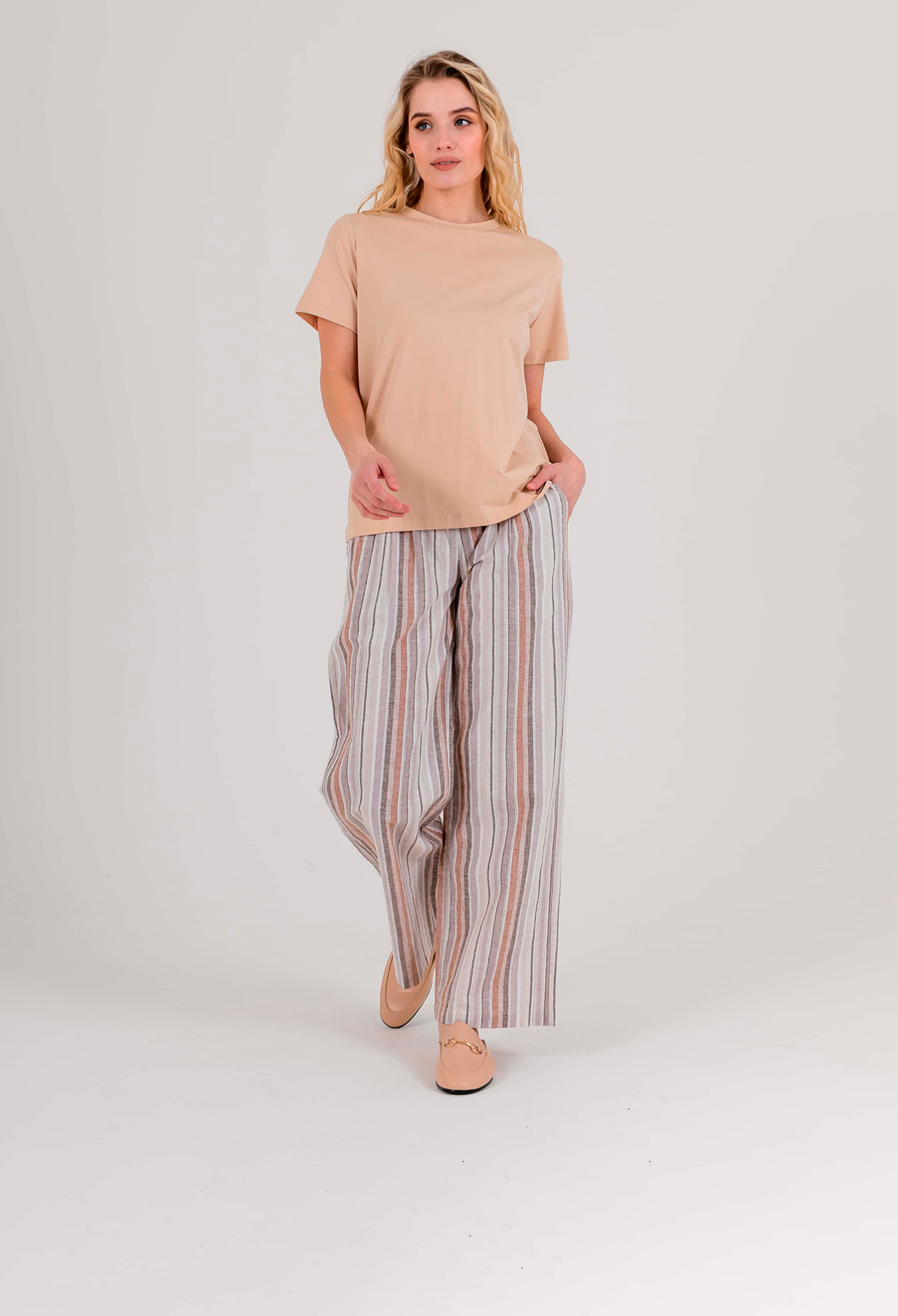 На сайте указаны российские размеры. Ткань: комфортный для тела, максимально дышащий материал изо льна и хлопка (55% лен, 45% хлопок). Крой: летние расклешенные брюки со средней посадкой. Благодаря продольной полоске визуально удлиняют силуэт, делая его стройным и подтянутым. Имеет два функциональных кармана спереди и два прорезных – сзади. Качественный крой и идеальная посадка обеспечивают комфорт и удобство при движении. Отделка: застегиваются на две удобные пуговицы и молнию. Шлевки на поясе позволяют дополнить брюки ремнем или поясом.