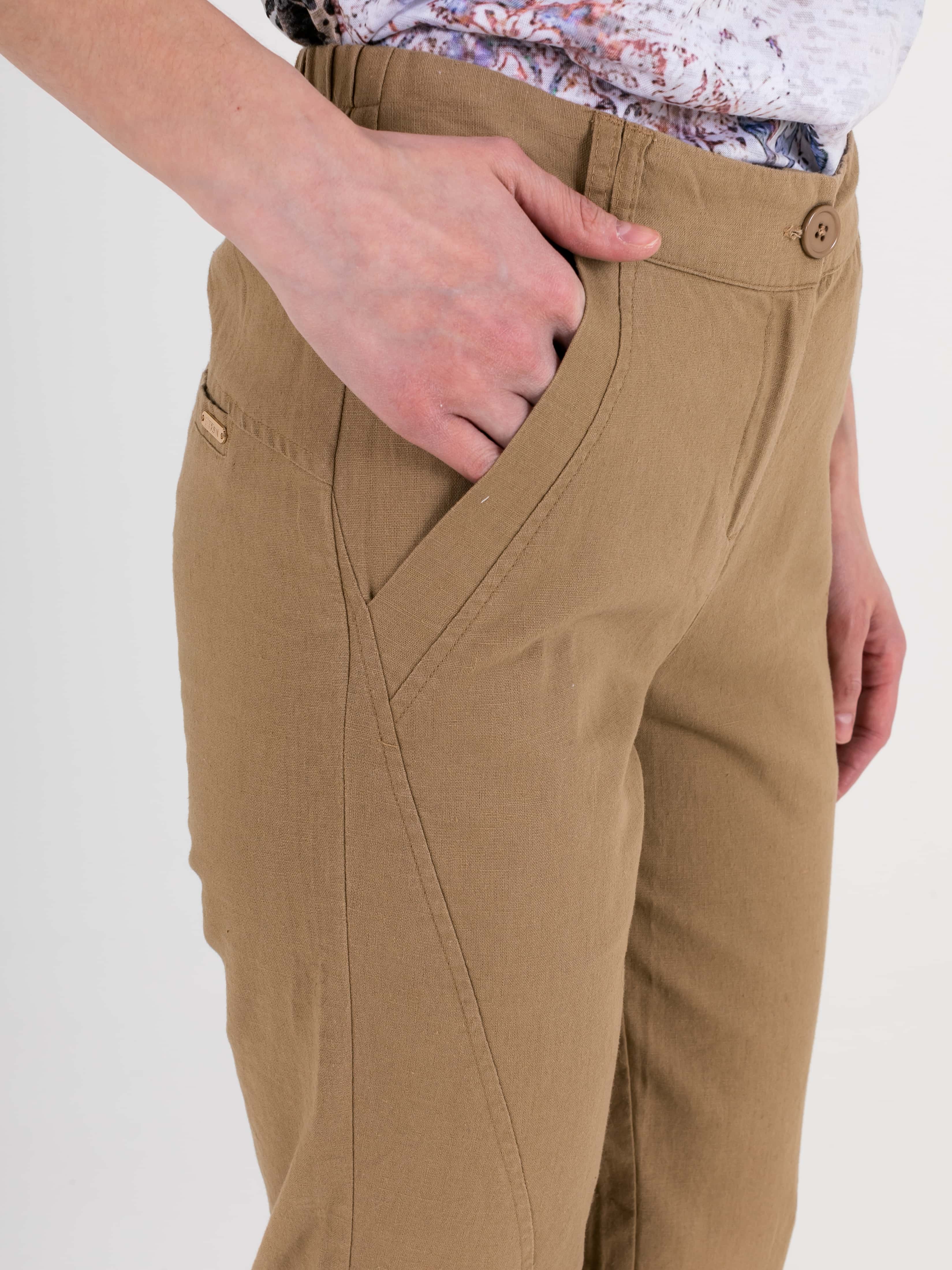 На сайте указаны российские размеры. Крой: стильная укороченная модель, красиво садящаяся по фигуре. Благородный бежевый оттенок, высокая посадка и функциональные карманы делают эти брюки абсолютным must-have во все времена. Создают подтянутый, стройный силуэт, удлиняют ноги и мастерски скрывают все недостатки. Отделка: оригинальные строчки в тон ткани, расположенные в верхней и нижней частях брюк, создают дополнительные вертикали и стройнят фигуру. Сзади расположены два прорезных кармана. Застегиваются на молнию и пуговицу. Имеют шлевки, что позволяет дополнять образ ремнем.