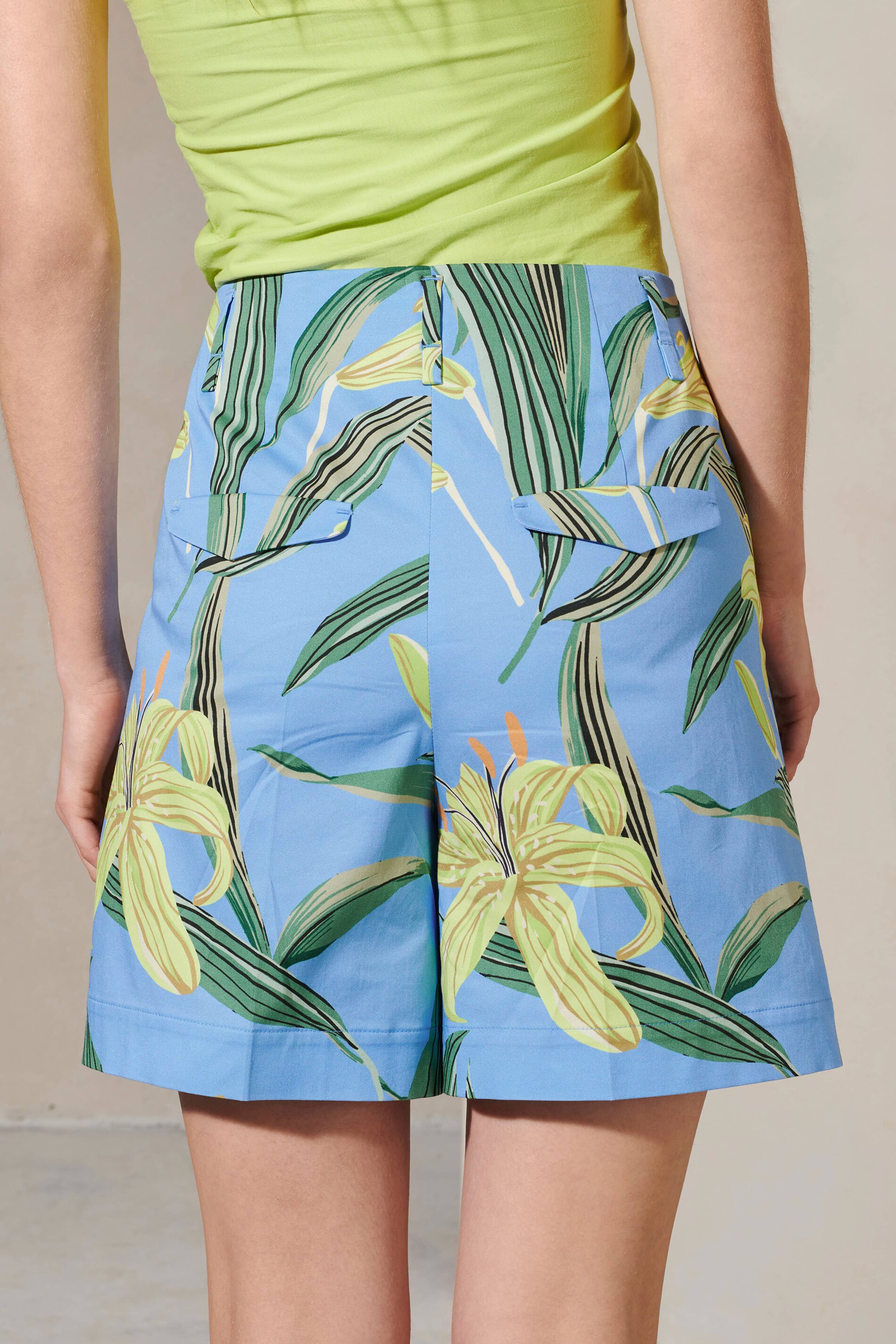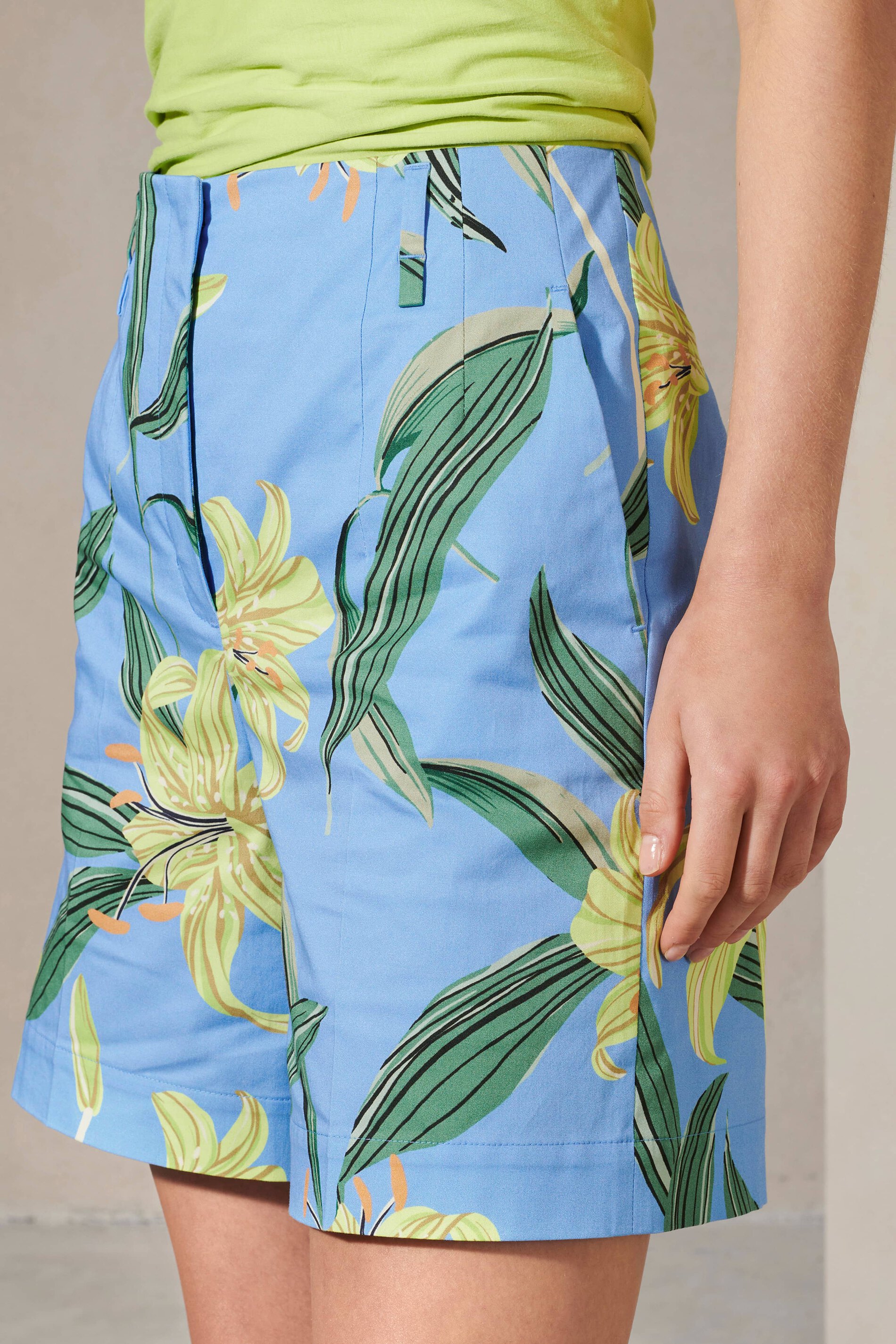 Шорты из спортивного хлопкового стрейча. Эксклюзивный дизайн лилии подчеркивает летний вид. Наряду с имитацией задних карманов брюки имеют шлевки для ремня и два боковых кармана.