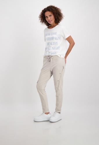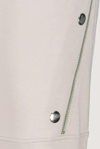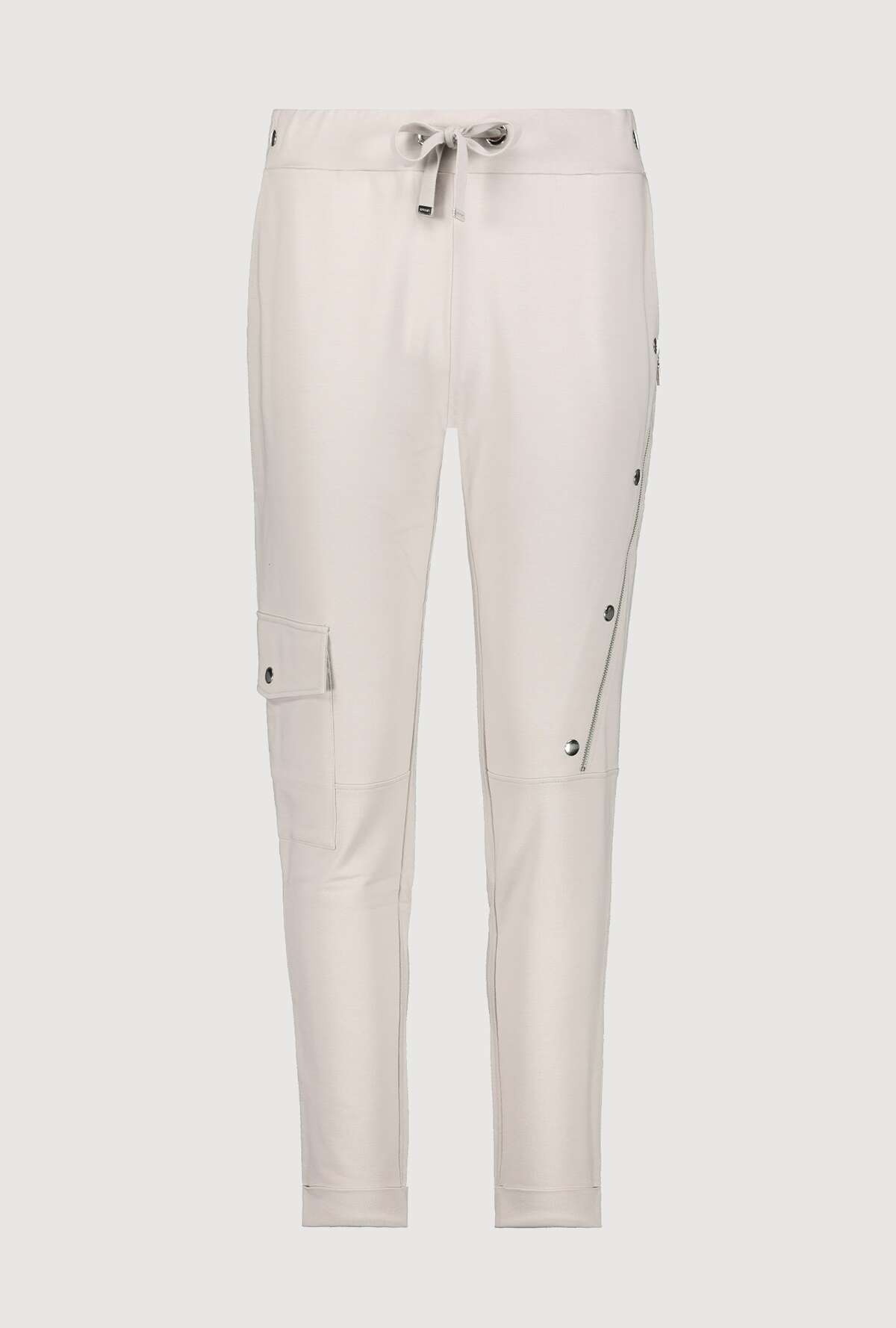 На сайте указаны российские размеры. Спортивные джоггеры monari в байкерском стиле. Пояс украшен декоративными пуговицами, талия на кулиске с проушинами и завязками, а также ребристая спинка. Боковые карманы, накладной карман с клапаном на уровне колена на правой штанине и диагональный шов с застежкой-молнией и декоративными пуговицами на левой штанине завершают дизайн довольно простой модели джоггеров. Параметры модели: 42 размер, рост 179 см