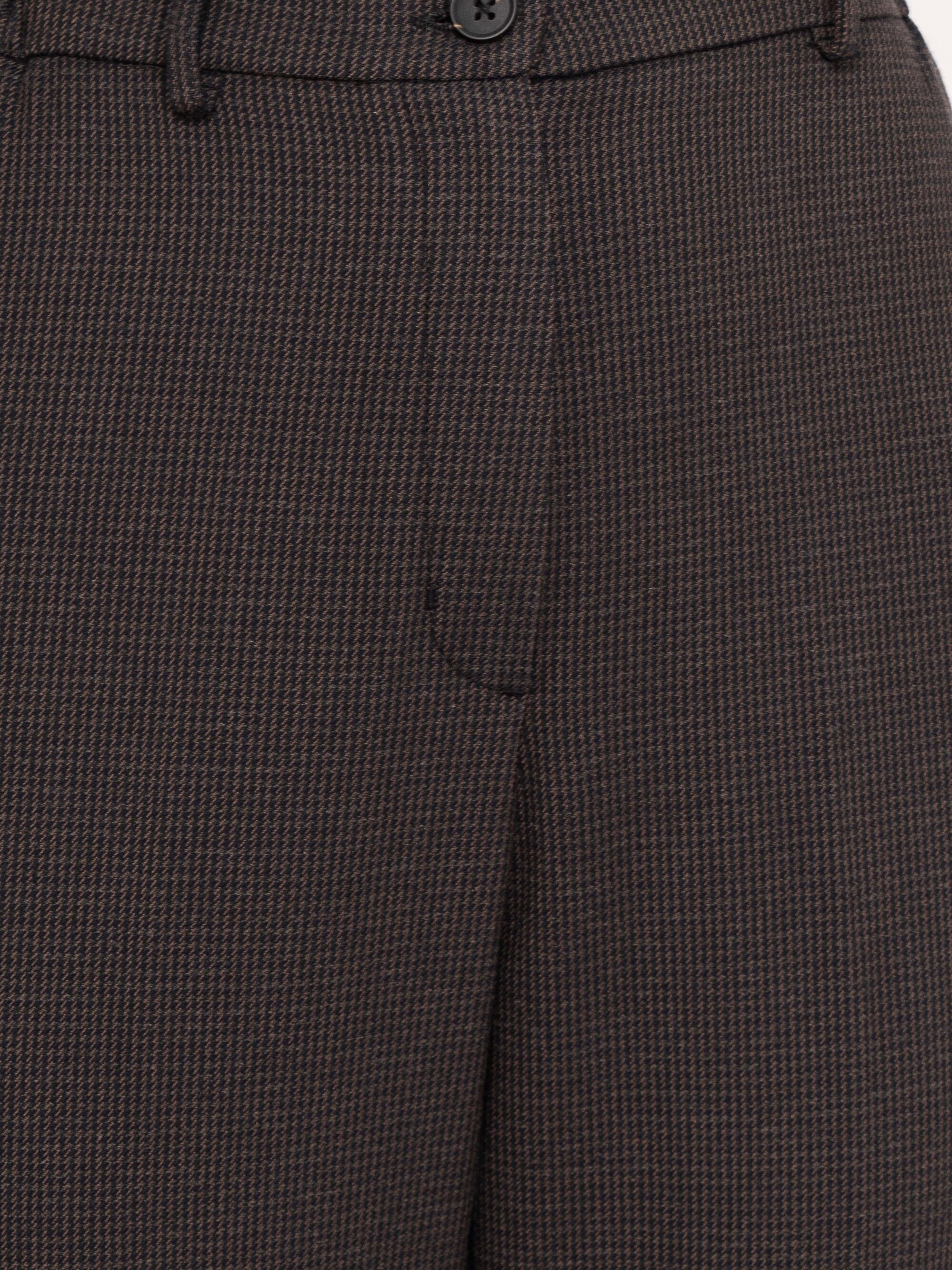 На сайте указаны российские размеры. Зауженные укороченные трикотажные коричневые брюки на молнии, с рисунком гусиная лапка. Идеальный офисный вариант. Рост модели: 175 см Длина брюк: 67 см.
