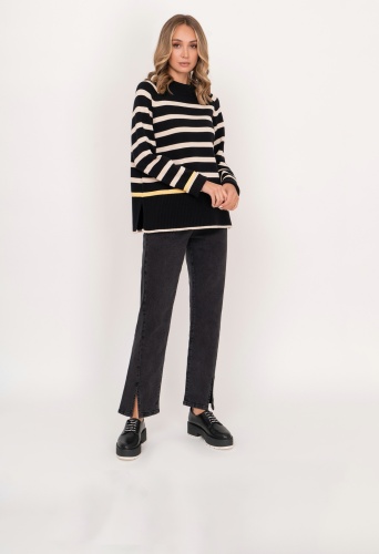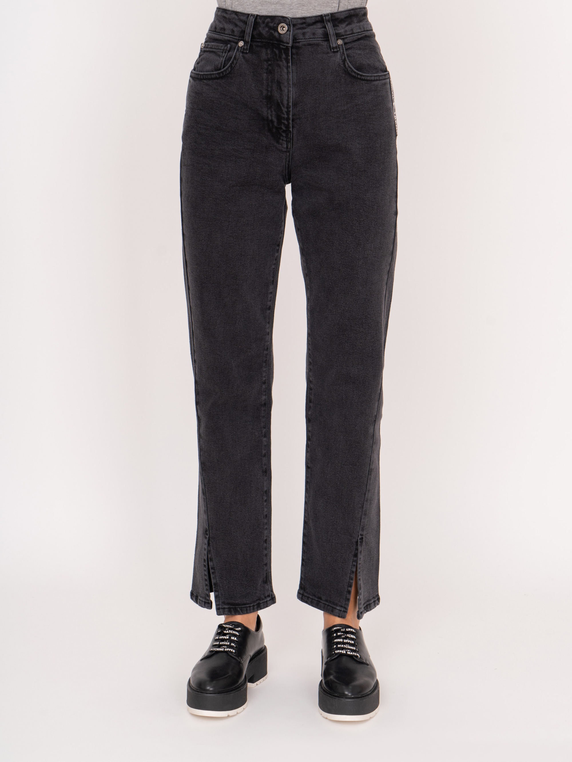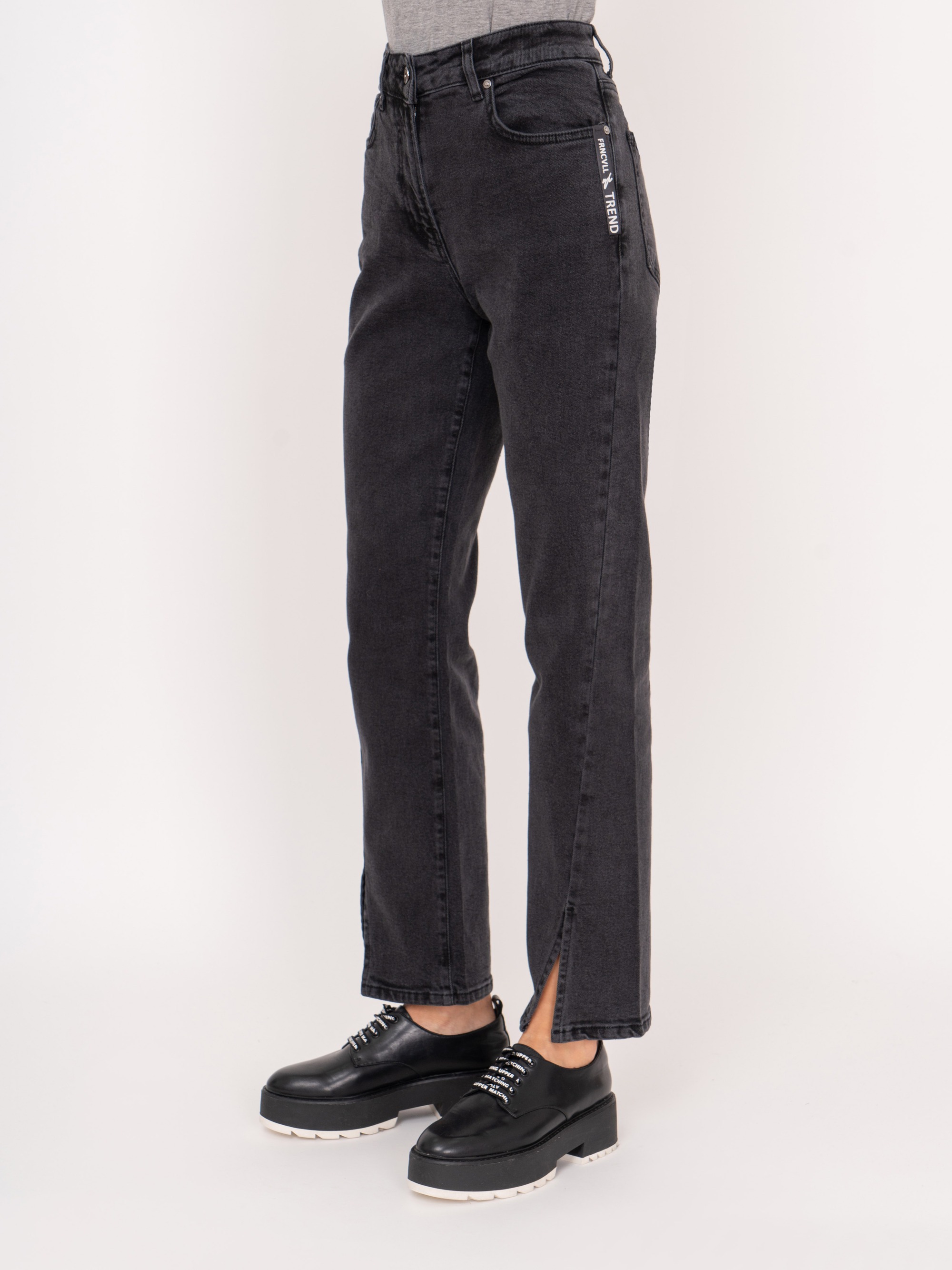 На сайте указаны российские размеры. Темно-серые джинсовые брюки клеш из плотного денима на молнии, с косыми и накладными карманами, с передними разрезами. Рост модели: 175 см Длина брюк: 77 см