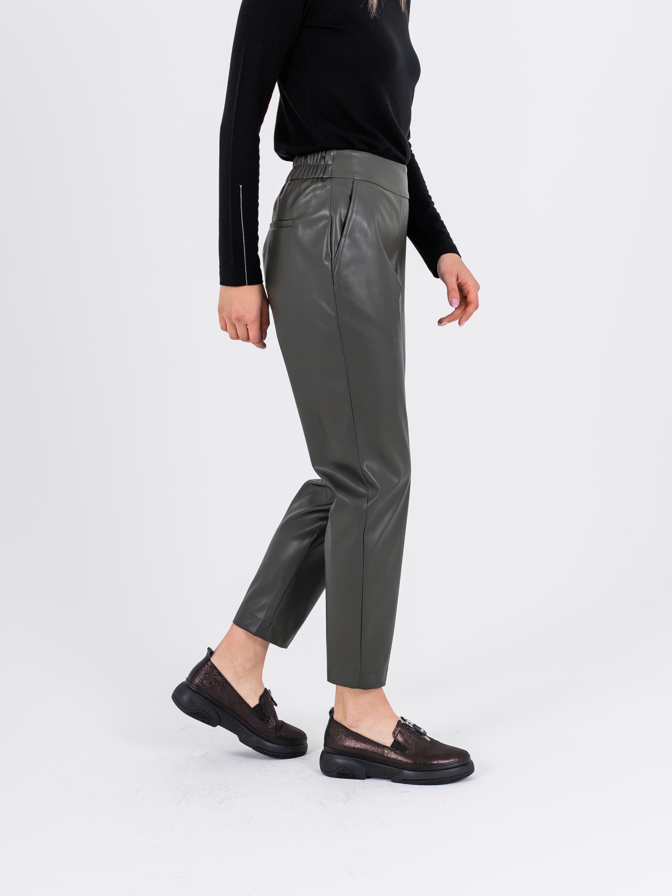 На сайте указаны российские размеры. Слегка укороченные брюки из экокожи в цвете хаки - просто писк моды. Брюки на резинке сзади. Модель имеет 4 кармана: 2 спереди и 2 сзади. Ткань: 55% полиуретан, 40% поливискоза, 5% эластан. Практичный материал, загрязнения с которого легко удаляются влажной салфеткой, что особенно актуально в межсезонье. Крой: ультрастильные кожаные брюки длины 7/8. Имеют средне-высокую посадку, которая подчеркивает красоту талии и скрывает недостатки в области живота. Прямой силуэт подходит под разные типы фигуры, уравновешивает область бедер и позволяет добиться максимального комфорта при движении. Брюки имеют два функциональных кармана спереди и два прорезных сзади. Отделка: особенностью модели является оригинальная зона пояса: гладкая спереди и собранная резинкой – сзади. Этот элемент обеспечивает дополнительный комфорт при надевании. Рост модели: 173 см