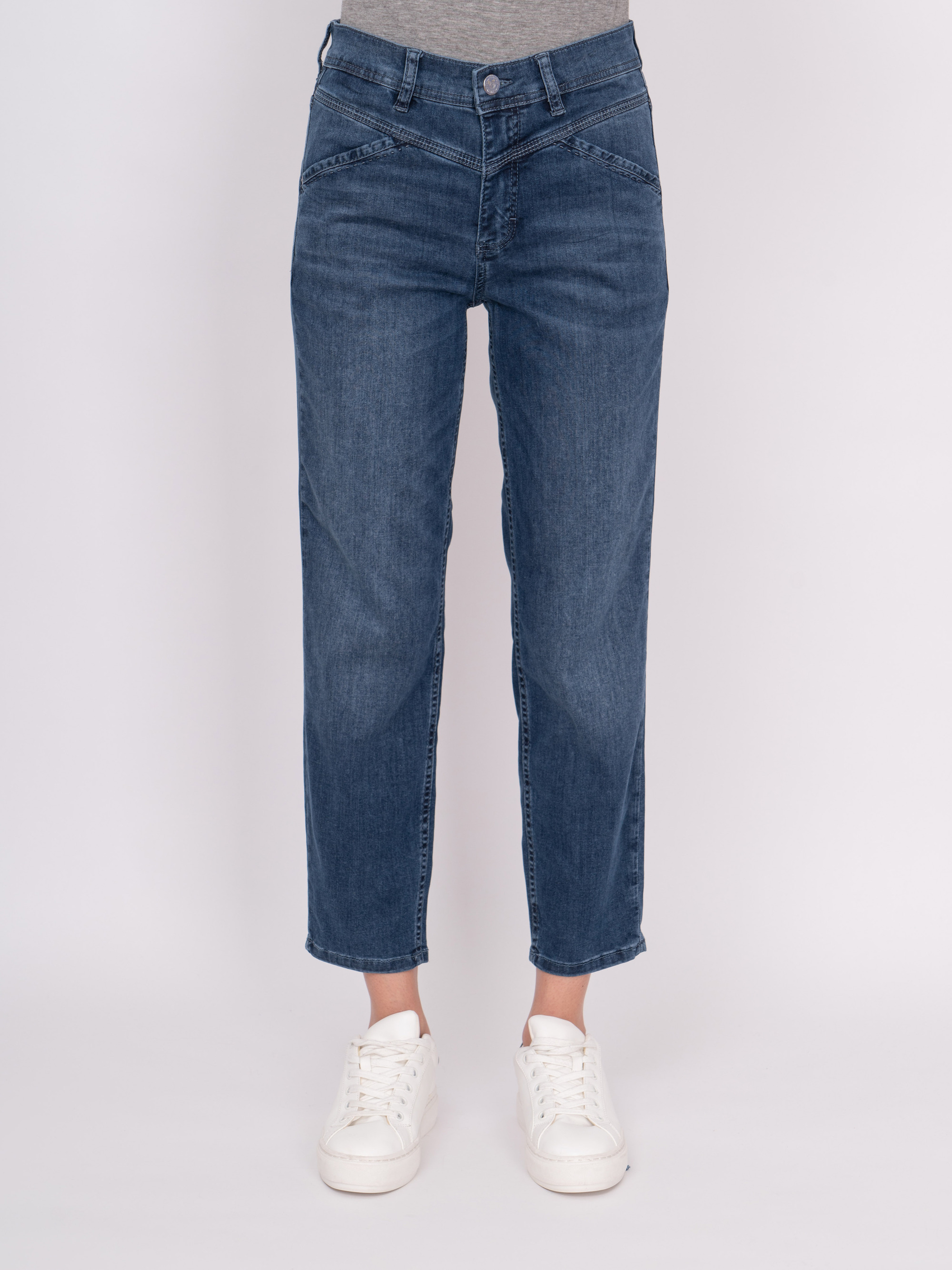 На сайте указаны российские размеры. Зауженные укороченные синие джинсы на молнии с косыми карманами, с накладными карманами. Рост модели 175 см. Длина брюк: 67 см.