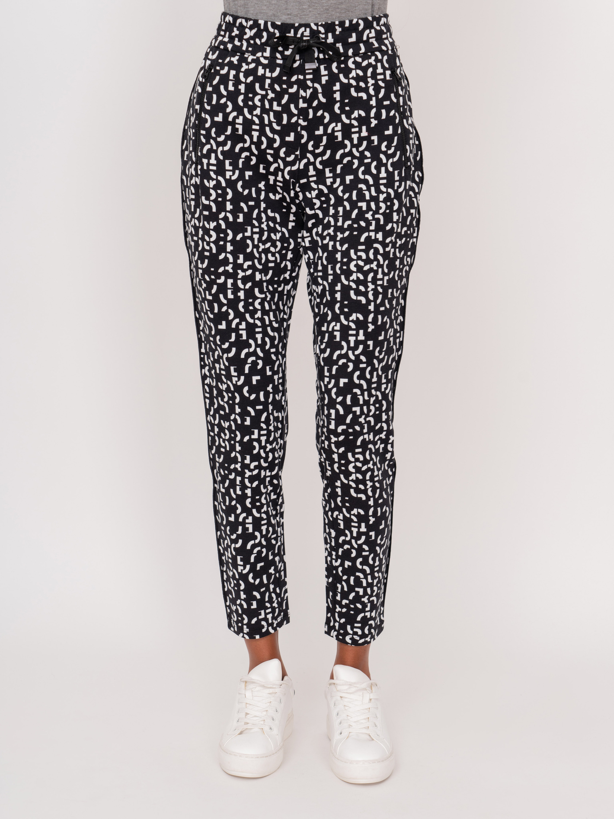 На сайте указаны российские размеры. Трикотажные черные зауженные брюки на резинке с завязками, с прорезными карманами на молнии, с белым абстрактным рисунком. Рост модели: 175 см. Длина брюк: 70 см.
