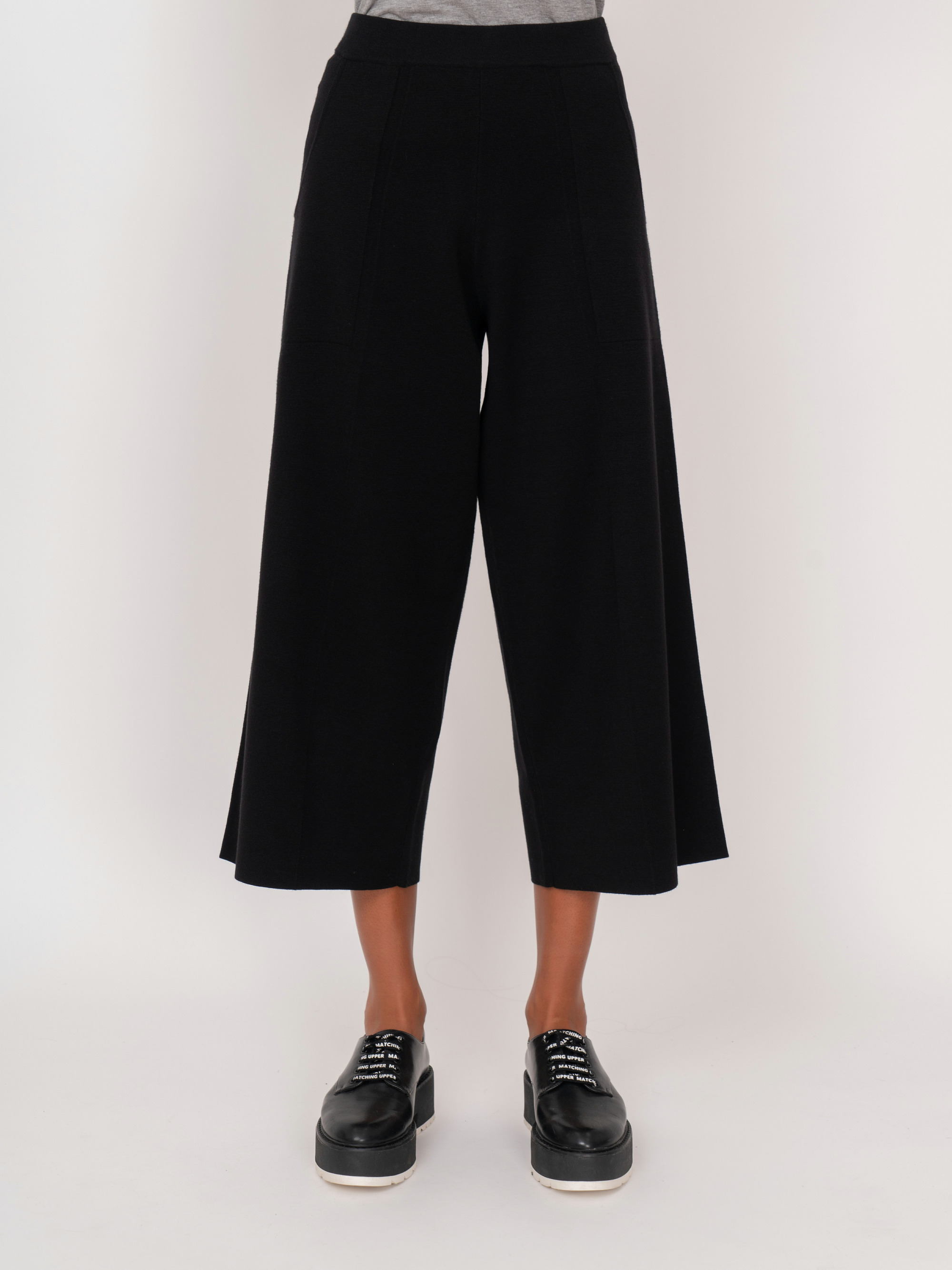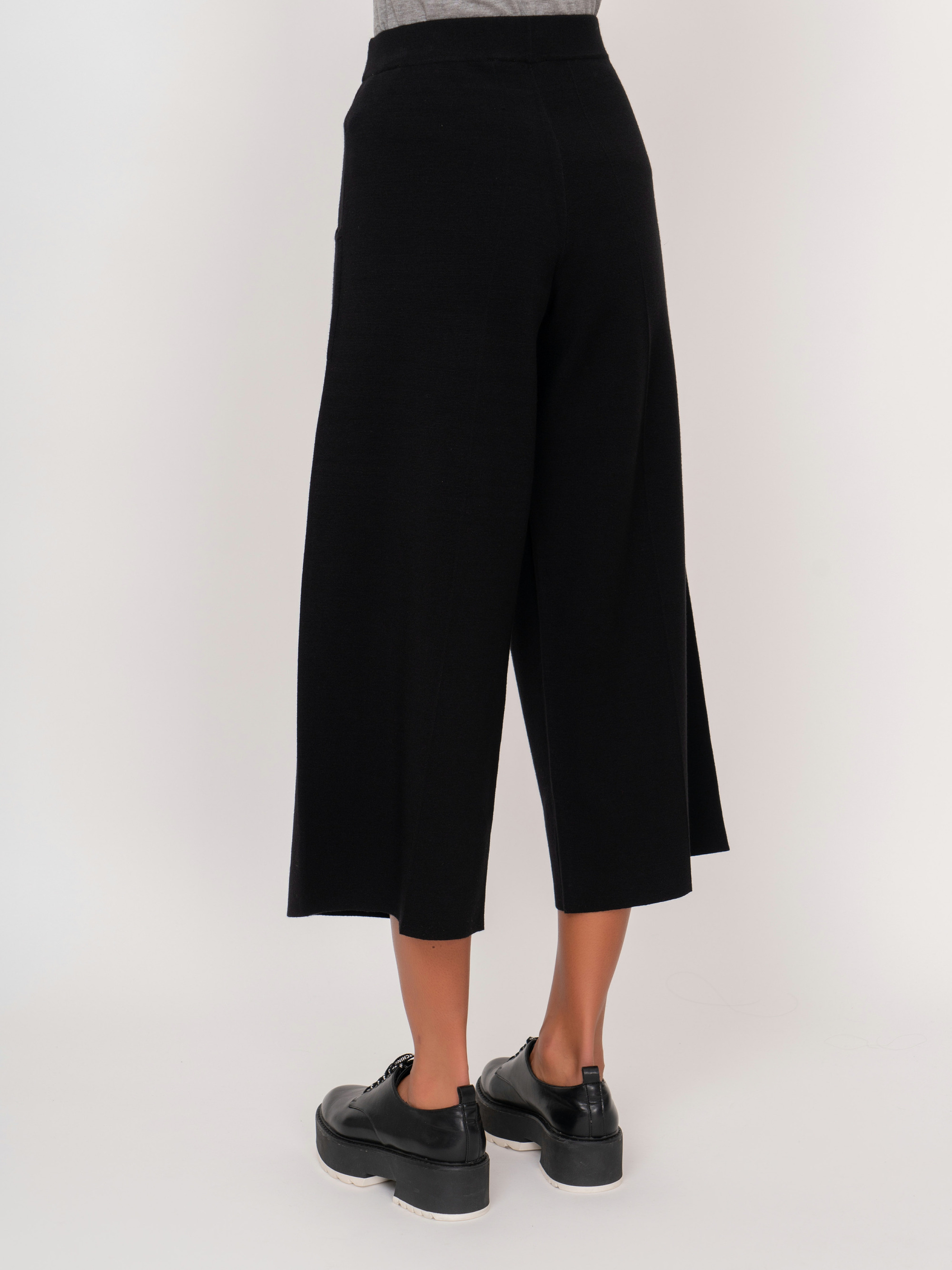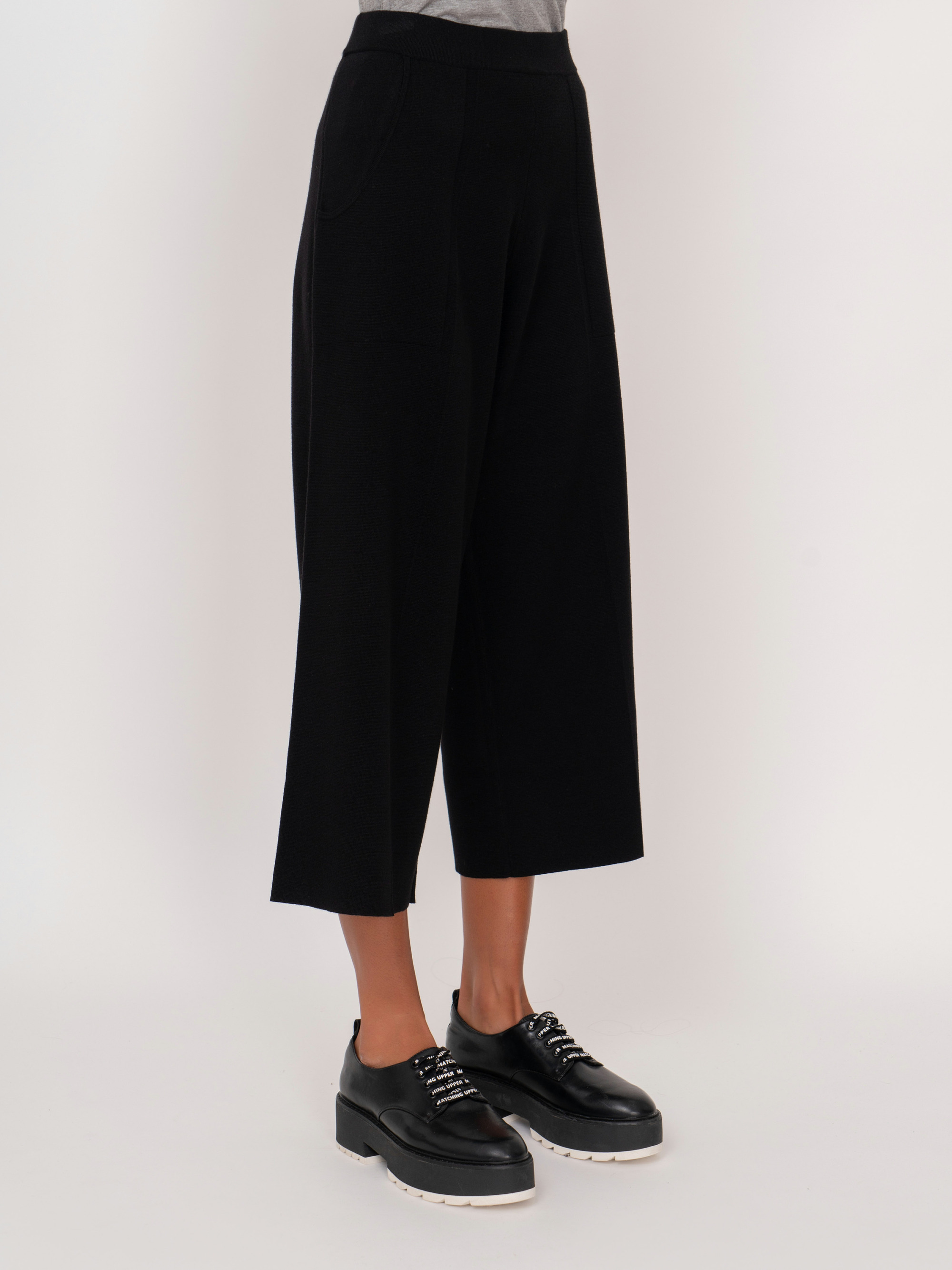 На сайте указаны российские размеры. Трикотажные черные укороченные широкие брюки на резинке, с накладными карманами. Рост модели: 175 см. Длина брюк: 60 см.