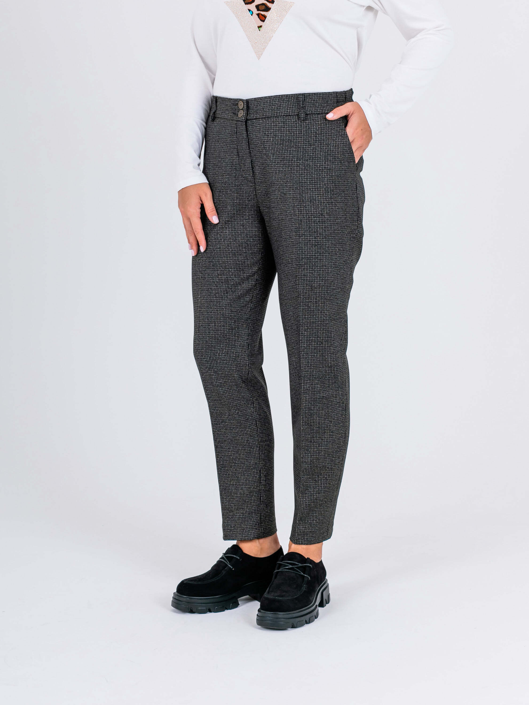 На сайте указаны российские размеры. Ткань: смесовая ткань в мелкую клетку средней плотности (63% полиэстер, 32% вискоза, 5% эластан) Крой: современная классика – брюки прямого кроя с высокой посадкой, идеально сидящие по фигуре. Имеют два удобных кармана спереди и два прорезных кармана сзади, а также строгие стрелки, которые добавляют образу законченности и стиля. Застегиваются на молнию и пуговицы. Отделка: задний карман украшен фирменным шильдиком Stern. В модели предусмотрены шлевки, в которые можно вдеть тонкий пояс или платок