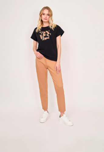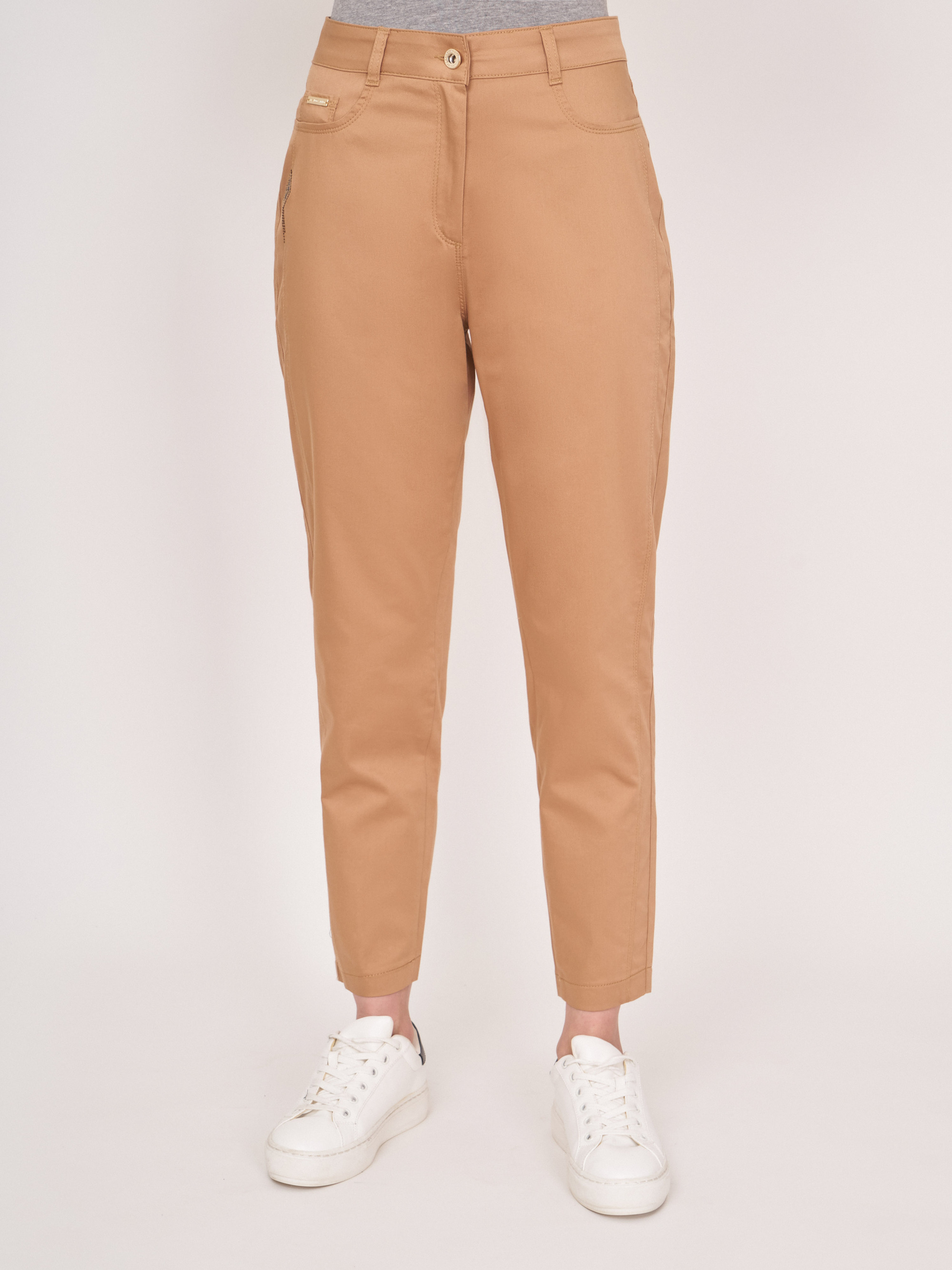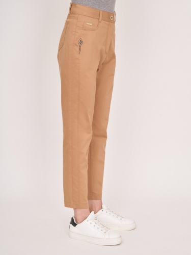 На сайте указаны российские размеры. Зауженные трикотажные темно-бежевые брюки на молнии, с накладными карманами, с вышивкой и стразами понизу с задней части брюк. Длина по спинке: 69 см. Рост модели: 176 см.