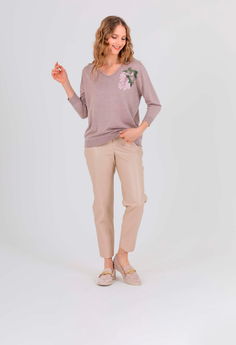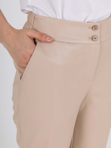 Брюки с завышенной талией длиной до щиколотки с застежкой на молнию и 2 пуговицы. Брюки слегка зауженные книзу. На передних половинках расположены два кармана с отрезным бочком. На задних половинках два прорезных кармана с листочками. Верх брюк обработан поясом на резинке.