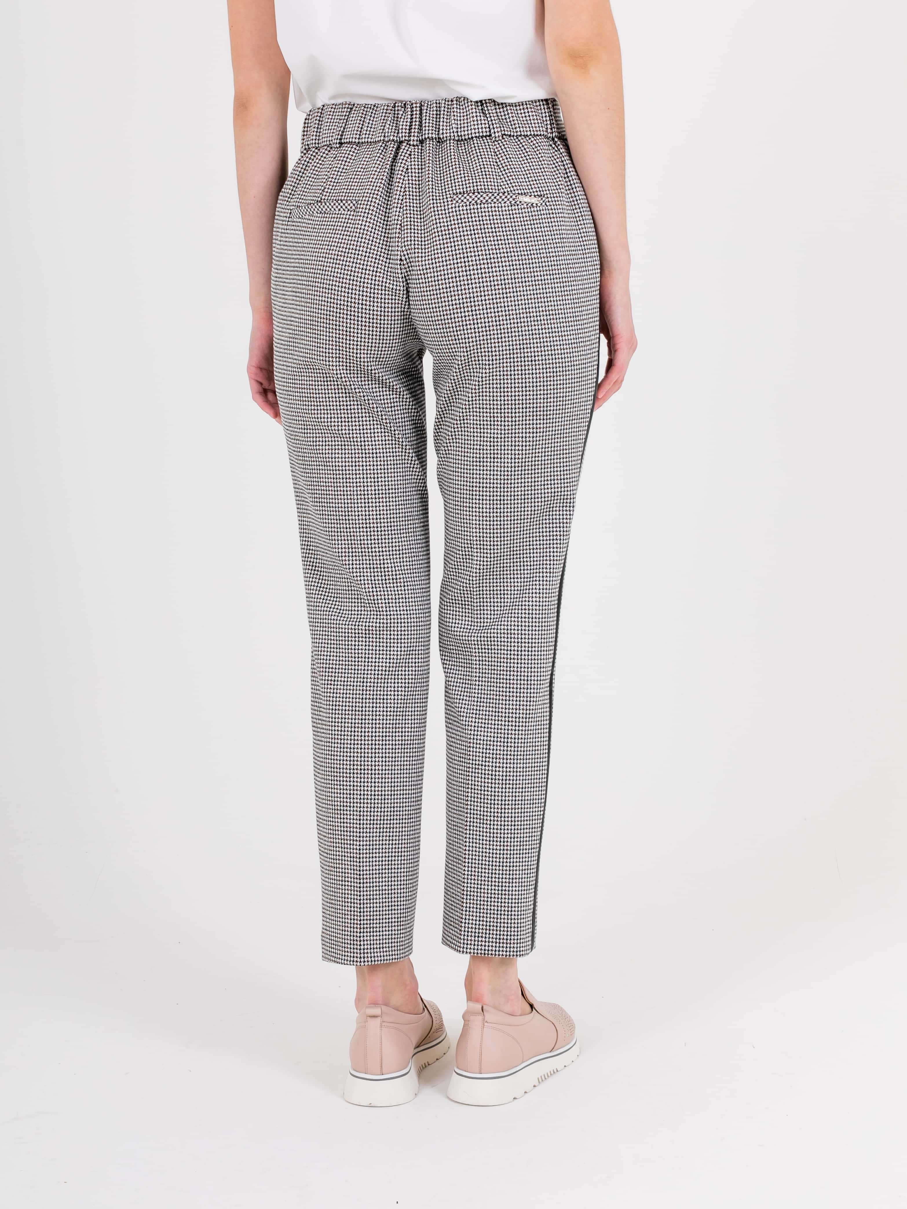 Прямые брюки с завышенной талией длиной до щиколотки с застежкой на молнию и 1 пуговицу, дизайнерская особенность модели – принт «клетка» и лампасы в боковых швах. Брюки слегка зауженные книзу. На передних половинках расположены два кармана с отрезным бочком. На задних половинках два прорезных кармана с листочками. Верх брюк обработан поясом на резинке со шлевками.