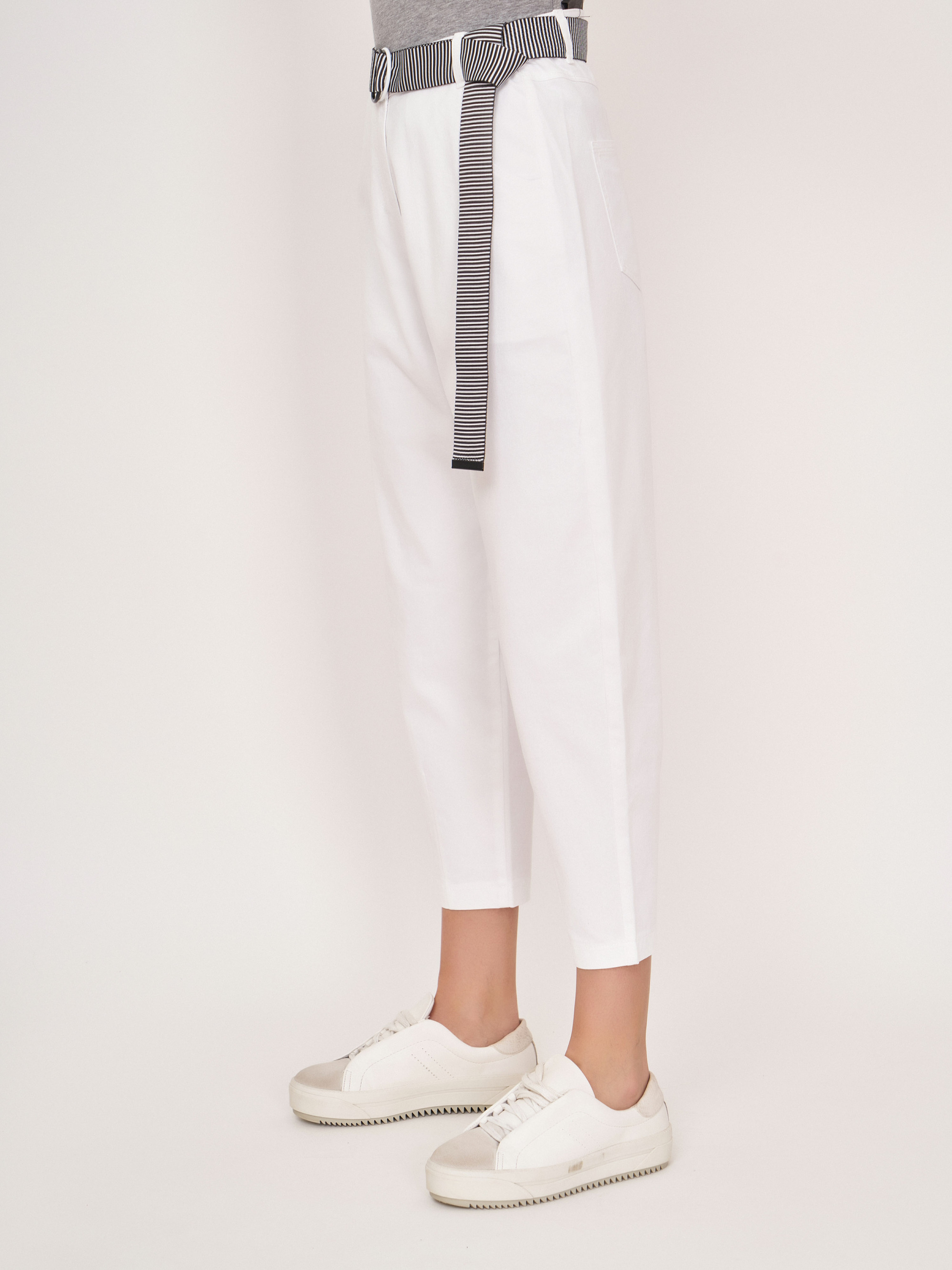 На сайте указаны российские размеры. Зауженные белые брюки бойфренды на молнии, с косыми и накладными карманами, с текстильным поясом, с рисунком бабочка. Длина брюк: 66 см. Рост модели: 177 см.