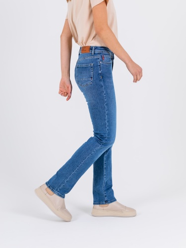 Длинные джинсы «Slim Fit» с застежкой на молнию и 1 пуговицу. Джинсы слегка зауженные книзу, с легким варёным эффектом. На передних половинках расположены два кармана с отрезным бочком и один монетный карман. На задних половинках два накладных кармана с декоративными горизонтальными швами и фигурная кокетка. Верх брюк обработан поясом со шлевками.