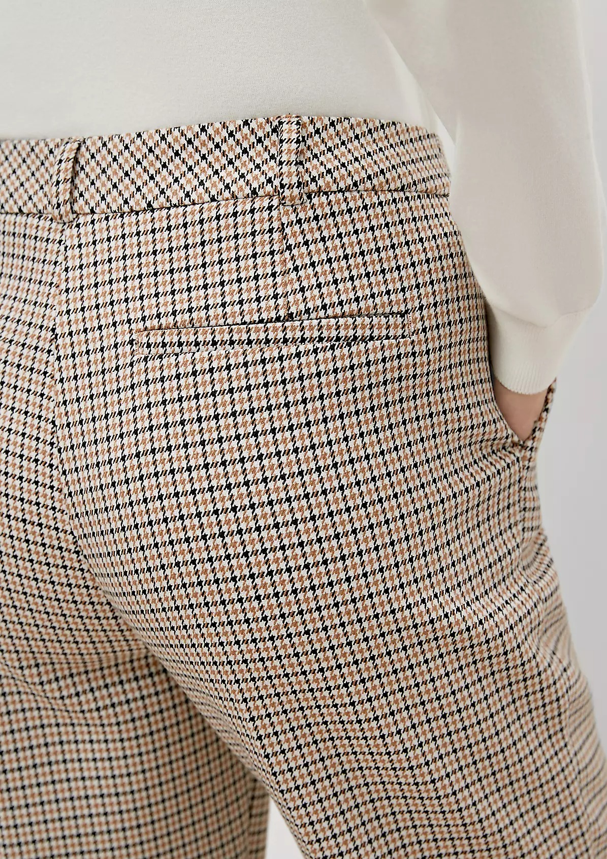 На сайте указаны российские размеры. Брюки классического кроя принта гусиная лапка. Застежка: молния, пуговица, крючок. Впереди прорезной карман, сзади ложный. Длина штанины по внутренней стороне для размера 42 около 78 см. Рост модели: 179 см