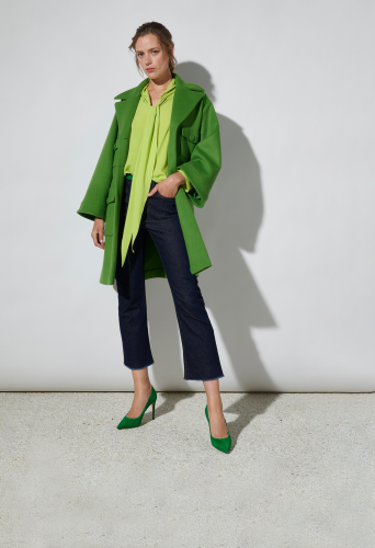 На сайте указаны российские размеры. Укороченные джинсы из аутентичного высокоэластичного денима с расклешенным силуэтом. Элегантные брюки с эффектом потертости, классическим дизайном с пятью карманами и открытой кромкой. Рост модели 178 см