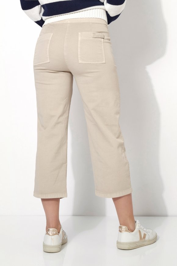 На сайте указаны российские размеры. Летние брюки из легкого смесового хлопка, с эластичным поясом, расклешенными штанинами и воздушной длиной 3/4. Длина по внутреннему шву: 60 см. Рост модели 178 см.