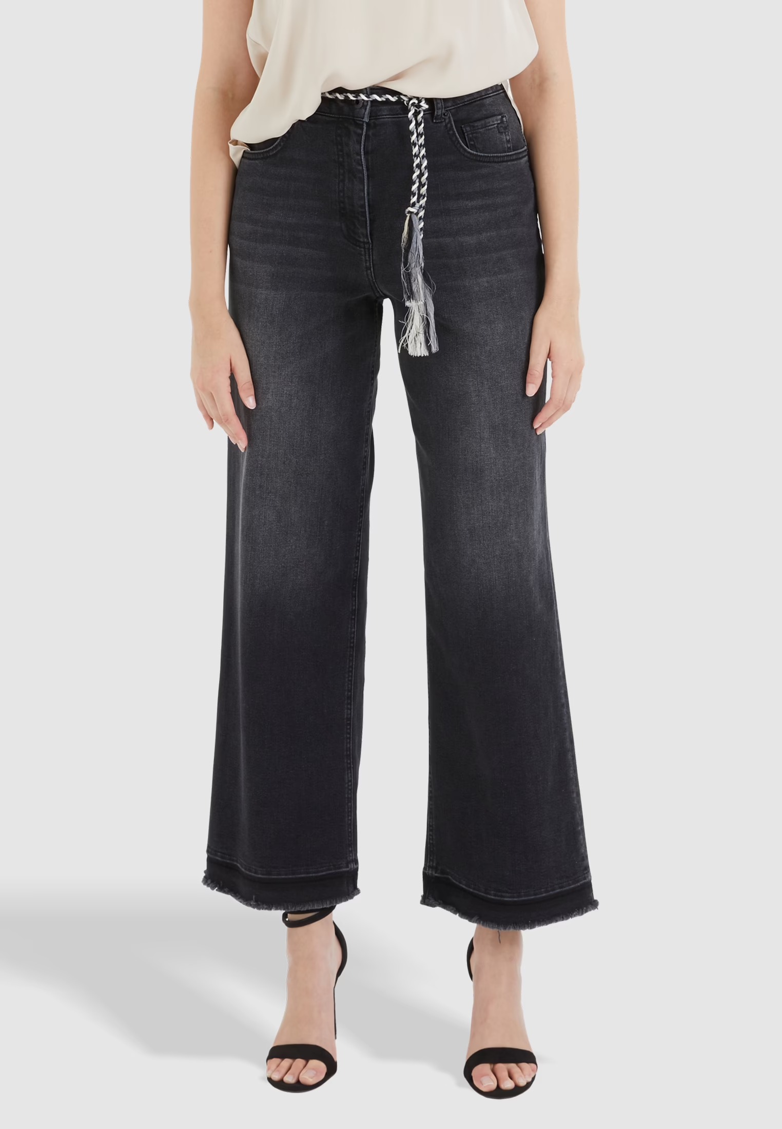 На сайте указаны российские размеры. Изготовленные из мягкой и прочной черной джинсовой ткани, эти джинсы привлекают внимание модным заниженным краем и съемной кулиской. Модель широкого кроя с пятью карманами отличается свободным кроем и высокой талией.