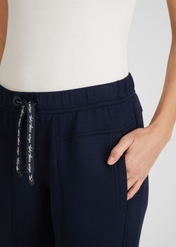 На сайте указаны российские размеры. Современные брюки узкого кроя не только впечатляют своим высоким комфортом при ношении. Брюки выполнены из мягкого смесового трикотажа и регулируются кулиской на поясе. Боковые карманы и декоративные швы придают брюкам непринужденный вид. Однотонную модель также можно хорошо сочетать с рубашками в стиле кэжуал. Длина штанины по внутренней стороне для размера 46: 72 см. Рост модели 176 см.