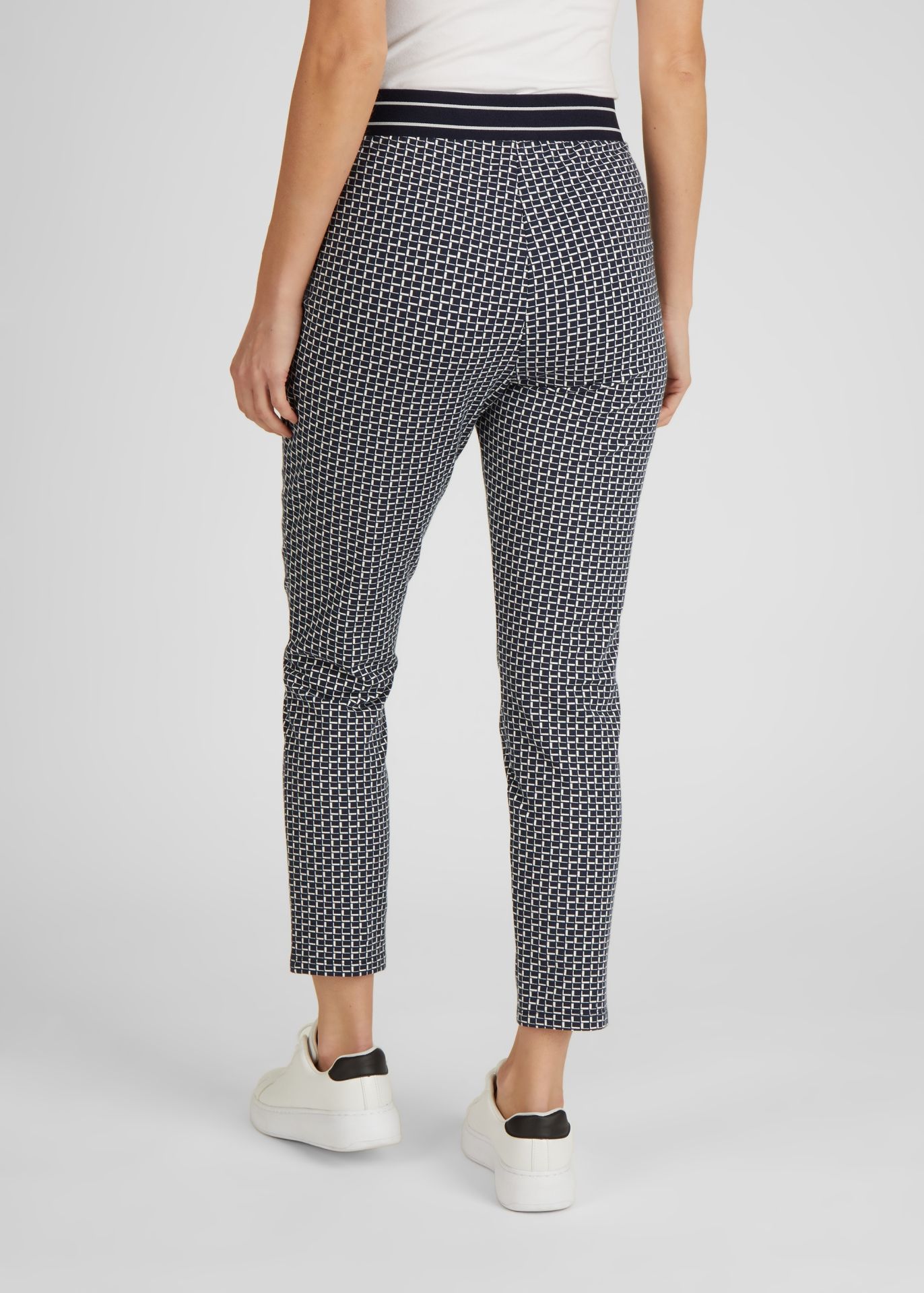 На сайте указаны российские размеры. Узкие эластичные брюки впечатляют своим современным графическим рисунком. Практичные карманы на молнии и эластичный пояс завершают модный образ. Эти брюки являются абсолютным must-have этого сезона. Длина штанины по внутренней стороне для размера 46: 69 см. Рост модели 176 см.