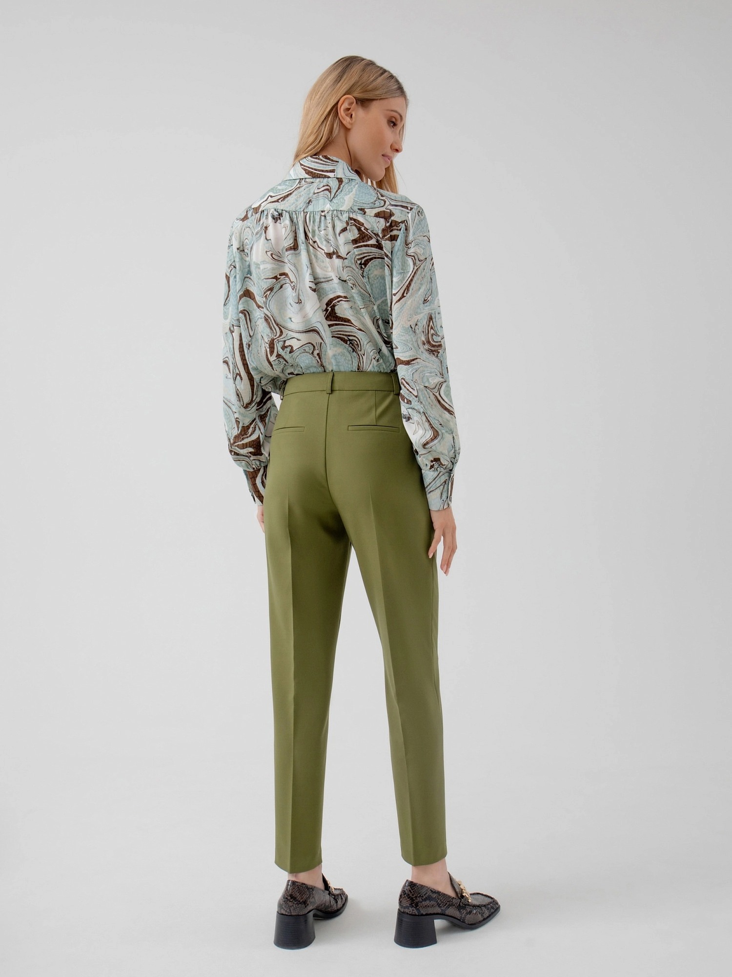 На сайте указаны российские размеры. Классические брюки со стрелками прямого силуэта на притачном поясе со шлевками и рабочими карманами по бокам фигурной формы. Застежка спереди на молнию и крючок. Сзади прорезные карманы с листочками. Рост модели 175 см.