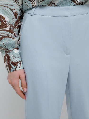 На сайте указаны российские размеры. Брюки со стрелками из костюмной ткани зауженного к низу силуэта на притачном поясе со шлевками. Спереди боковые карманы и застежка на молнию и крючок. Рост модели 175 см.