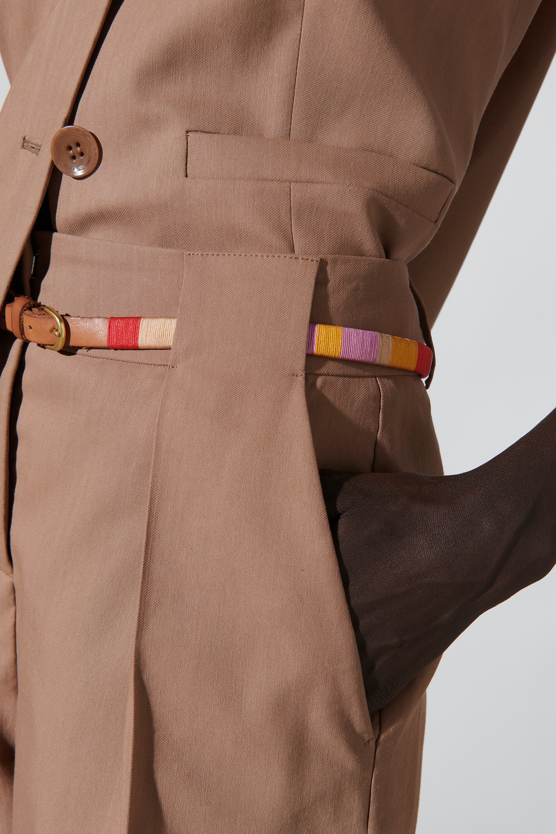 На сайте указаны российские размеры. Брюки из легкого габардина с летней текстурой крепа и зауженным кроем. Слегка укороченный фасон со складками спереди и широкими шлевками для ремня создает стильный образ. Рост модели 178 см.