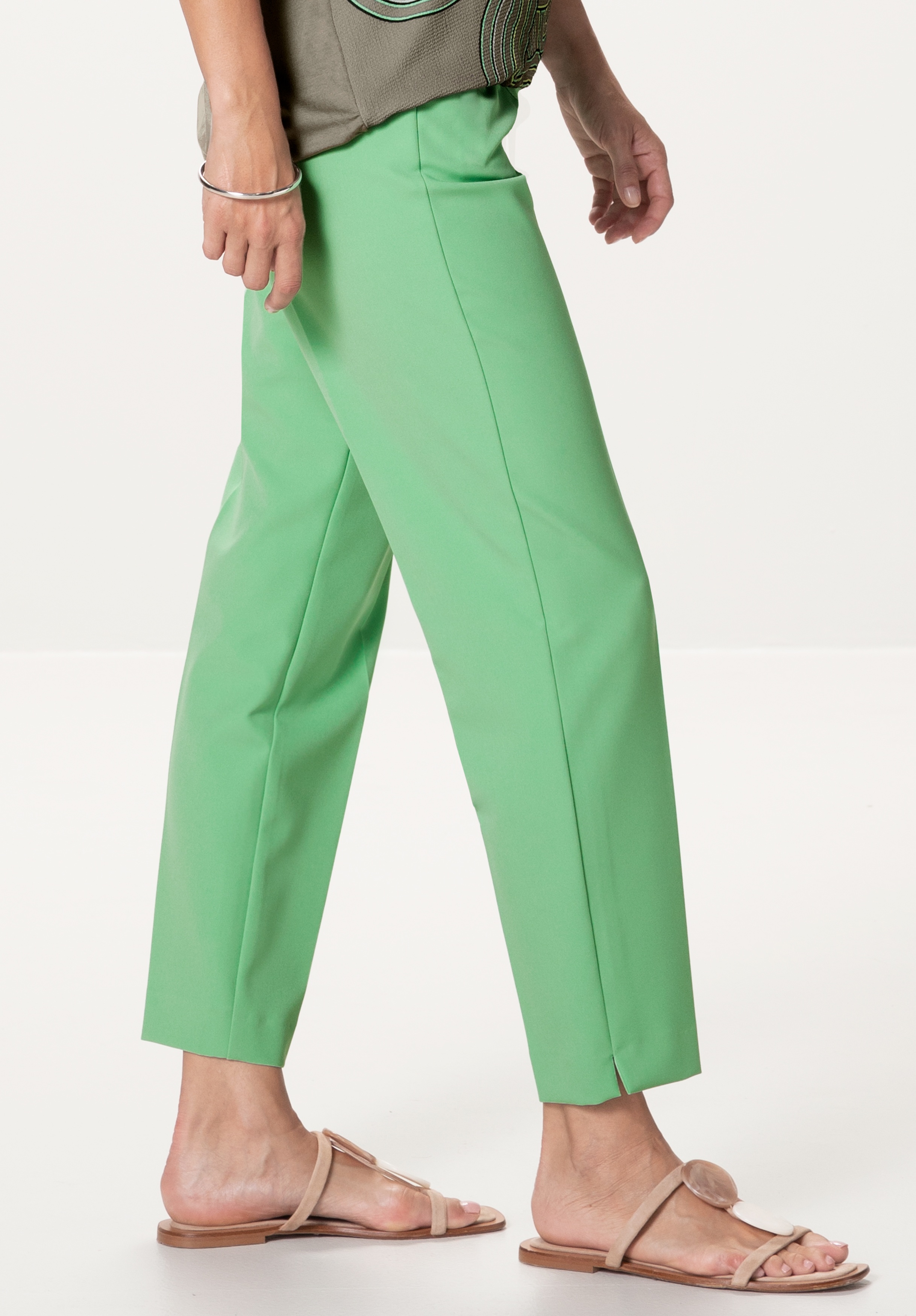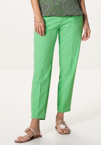 На сайте указаны российские размеры. Модные стрейчевые брюки. Благодаря высококачественному материалу с эластичным эластаном и застежке на крючок спереди она невероятно удобна. Передние карманы в сочетании со складкой и небольшими разрезами по низу завершают повседневный образ укороченных брюк прямого кроя. Длина в размере 44 около 68 см.