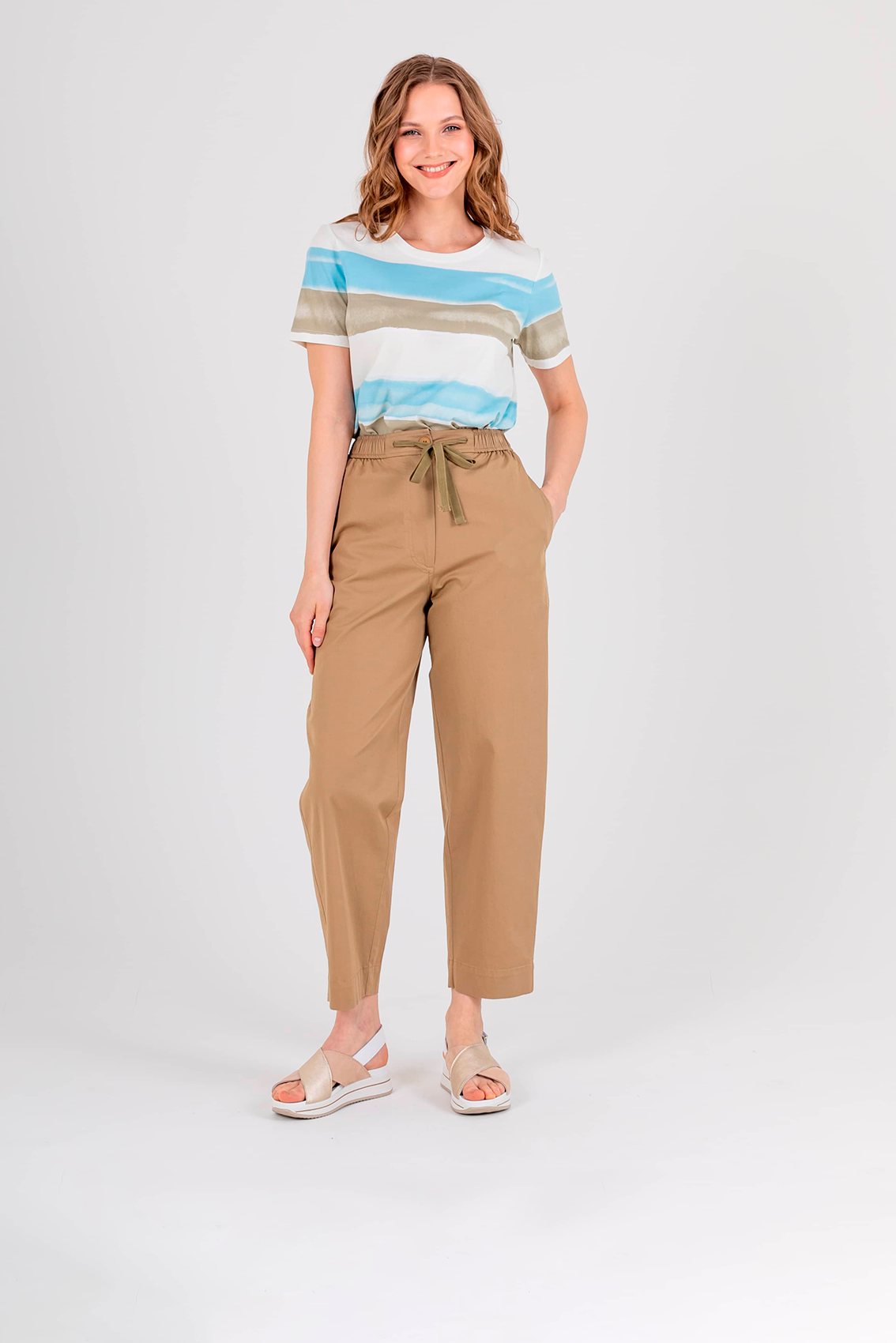 Джинсы «Carrot fit» с завышенной талией длиной до щиколотки с застежкой на молнию и 1 пуговицу. Джинсы слегка зауженные книзу. Два кармана в боковых швах с патами. На задних половинках фигурная кокетка и накладной карман. Верх брюк обработан поясом на резинке со шнуром.