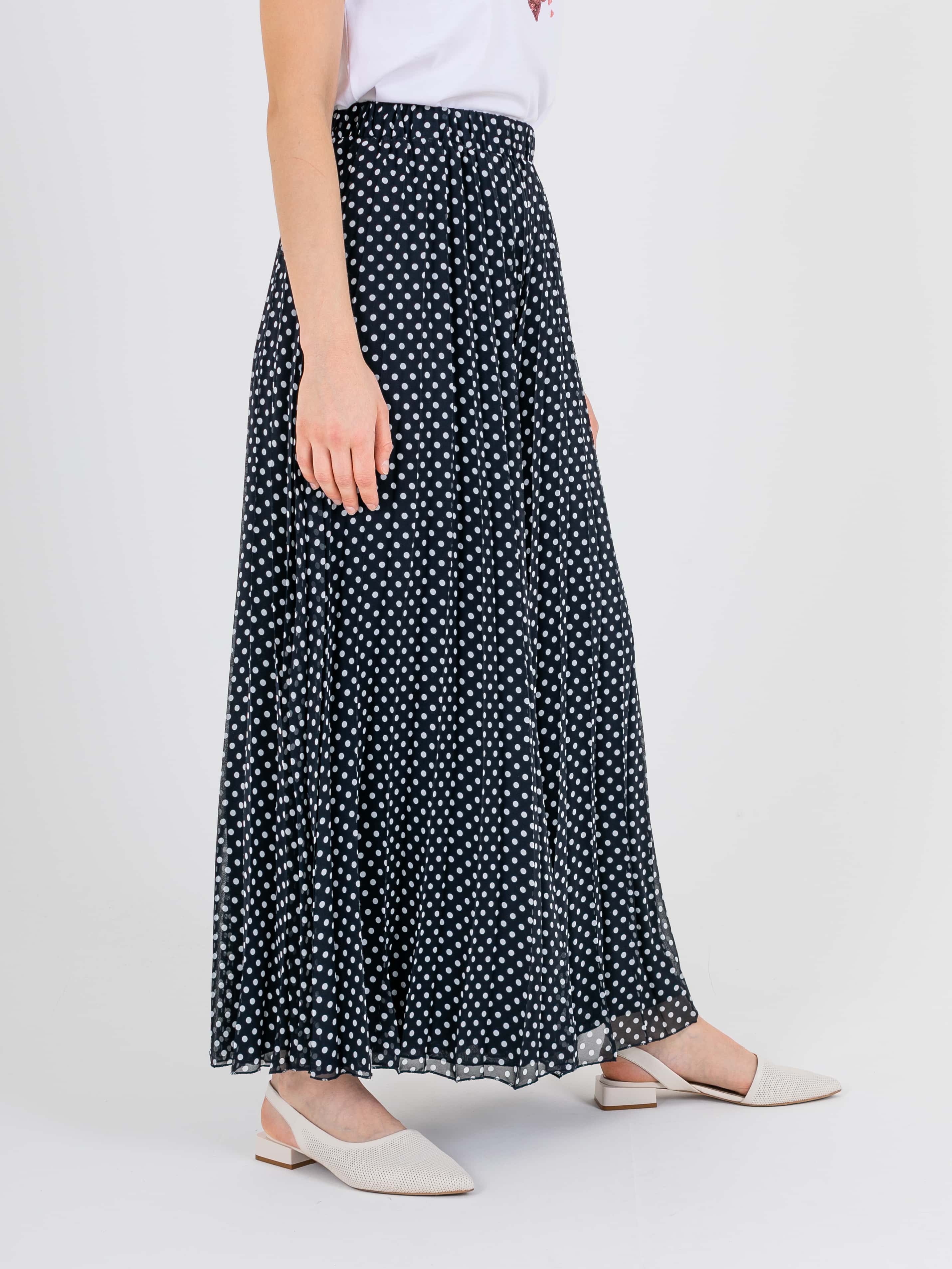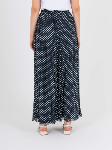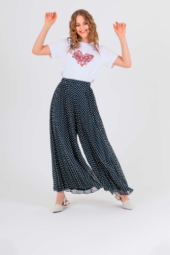 Длинные легкие брюки «палаццо», дизайнерская особенность модели – яркий принт «горошек» и плиссировка. Верх брюк обработан поясом на резинки. Брюки на подкладке.