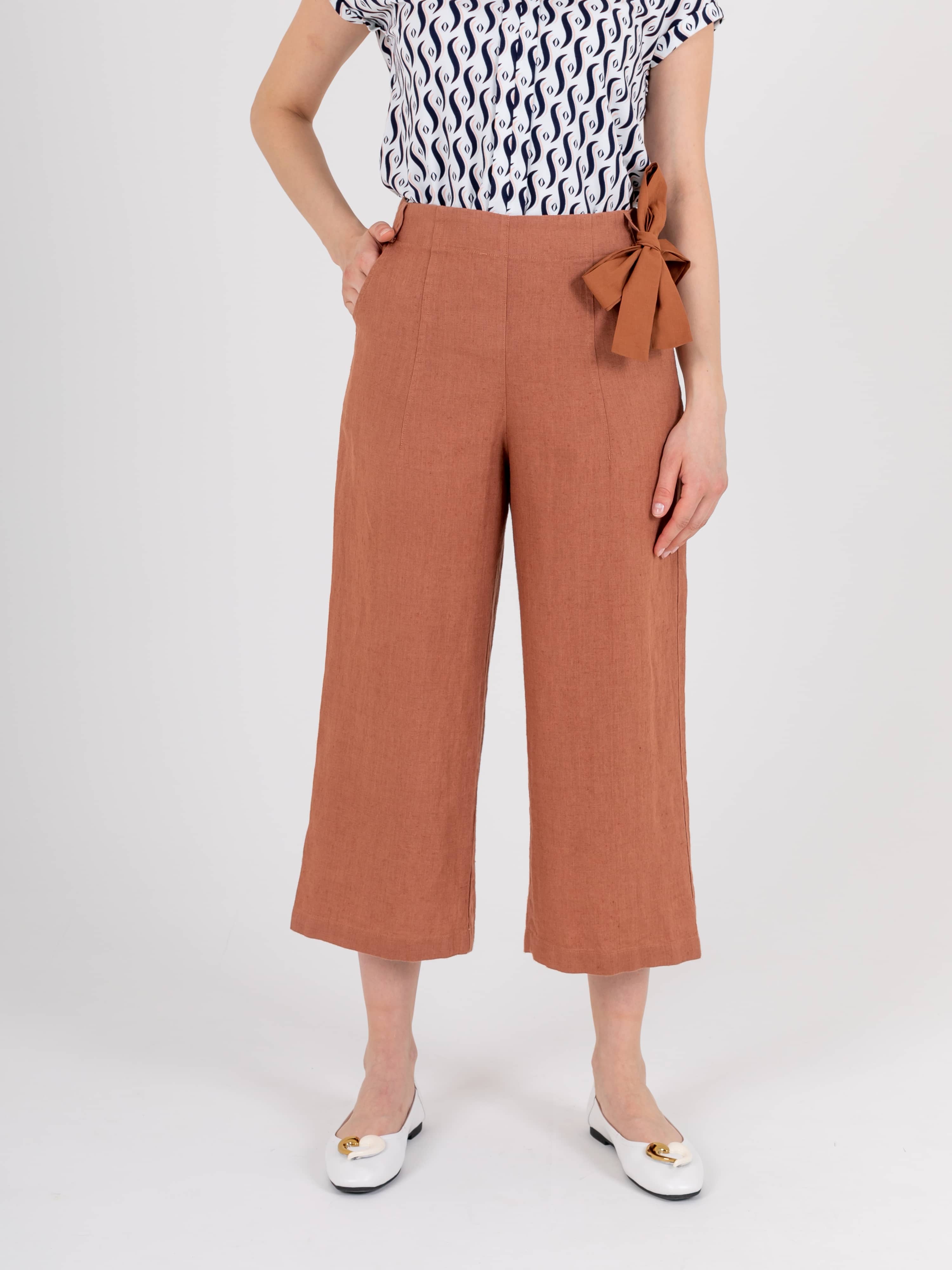 Укороченный прямые брюки, длиной до щиколоток «трубы» с застежкой на молнию в боковом шве из натурального льна. На передних половинках расположены два кармана с отрезным бочком. Верх брюк обработан поясом на резинке и со шлевками, также есть съемный пояс.