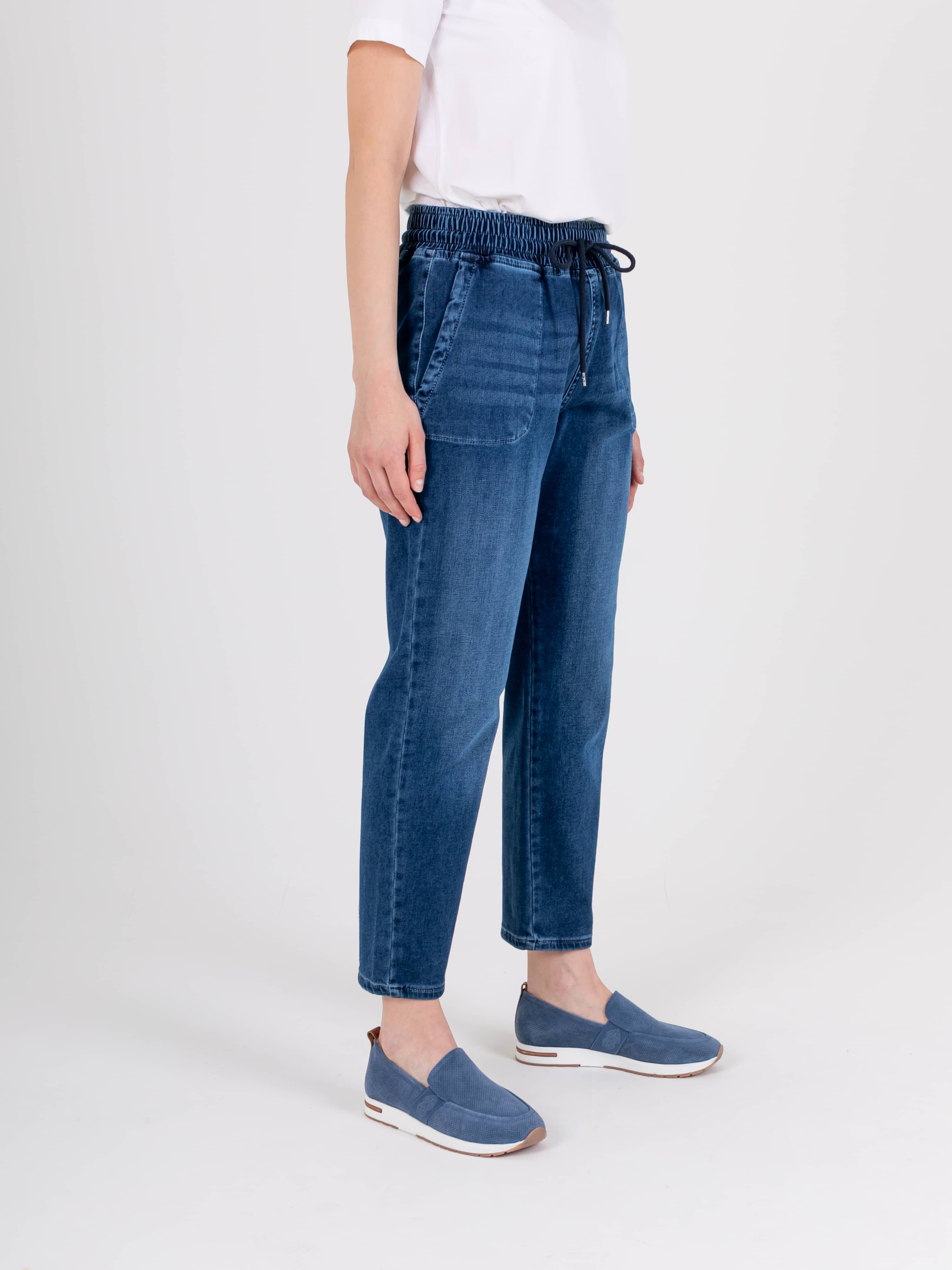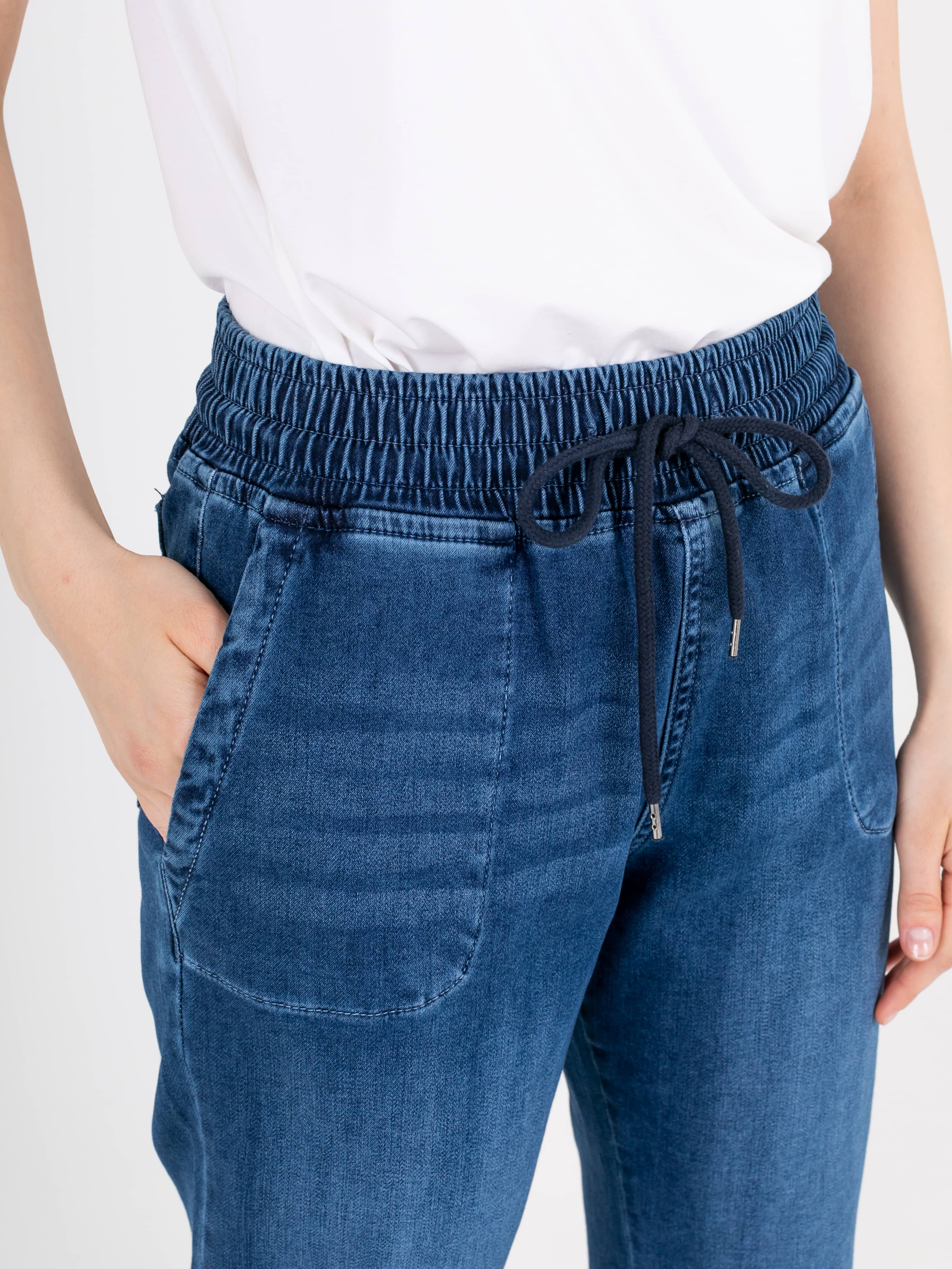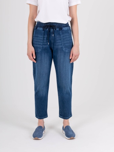 Джинсы «Basic» с завышенной талией длиной до щиколотки с имитацией гульфика без застежки. Джинсы слегка зауженные книзу, с легким варёным эффектом. На передних половинках расположены два кармана с отрезным бочком. На задних половинках два накладных кармана. Верх брюк обработан поясом на резинке со шнуром и металлическими наконечниками.