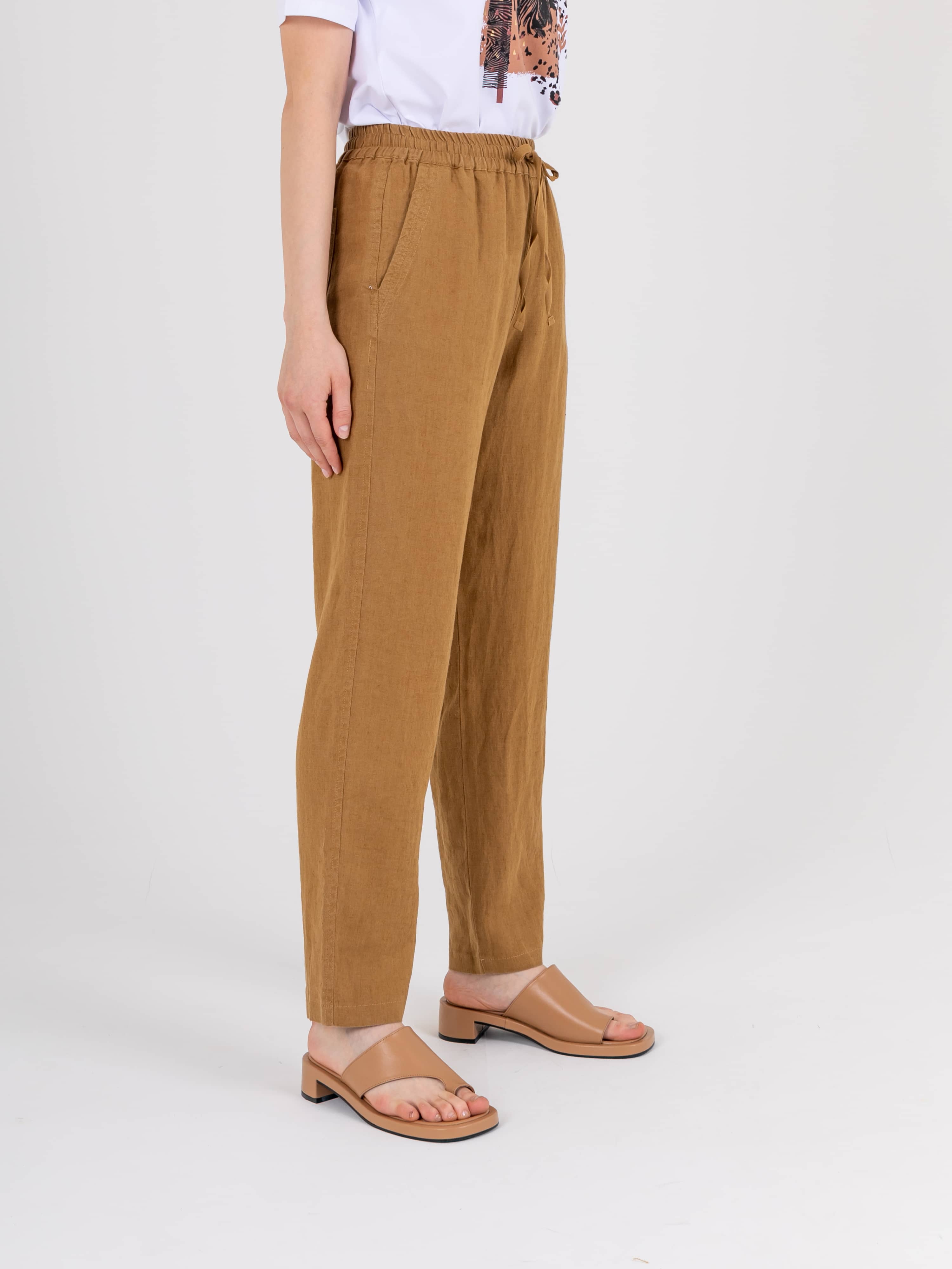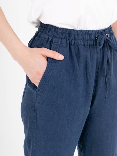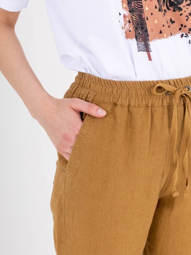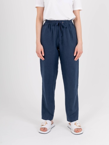 Прямые брюки с завышенной талией, длиной до щиколоток. На передних половинках расположены два кармана с отрезным бочком. На задних половинках брюк расположены накладные карманы. Верх брюк на резинке со шнуром для регулировки объема.