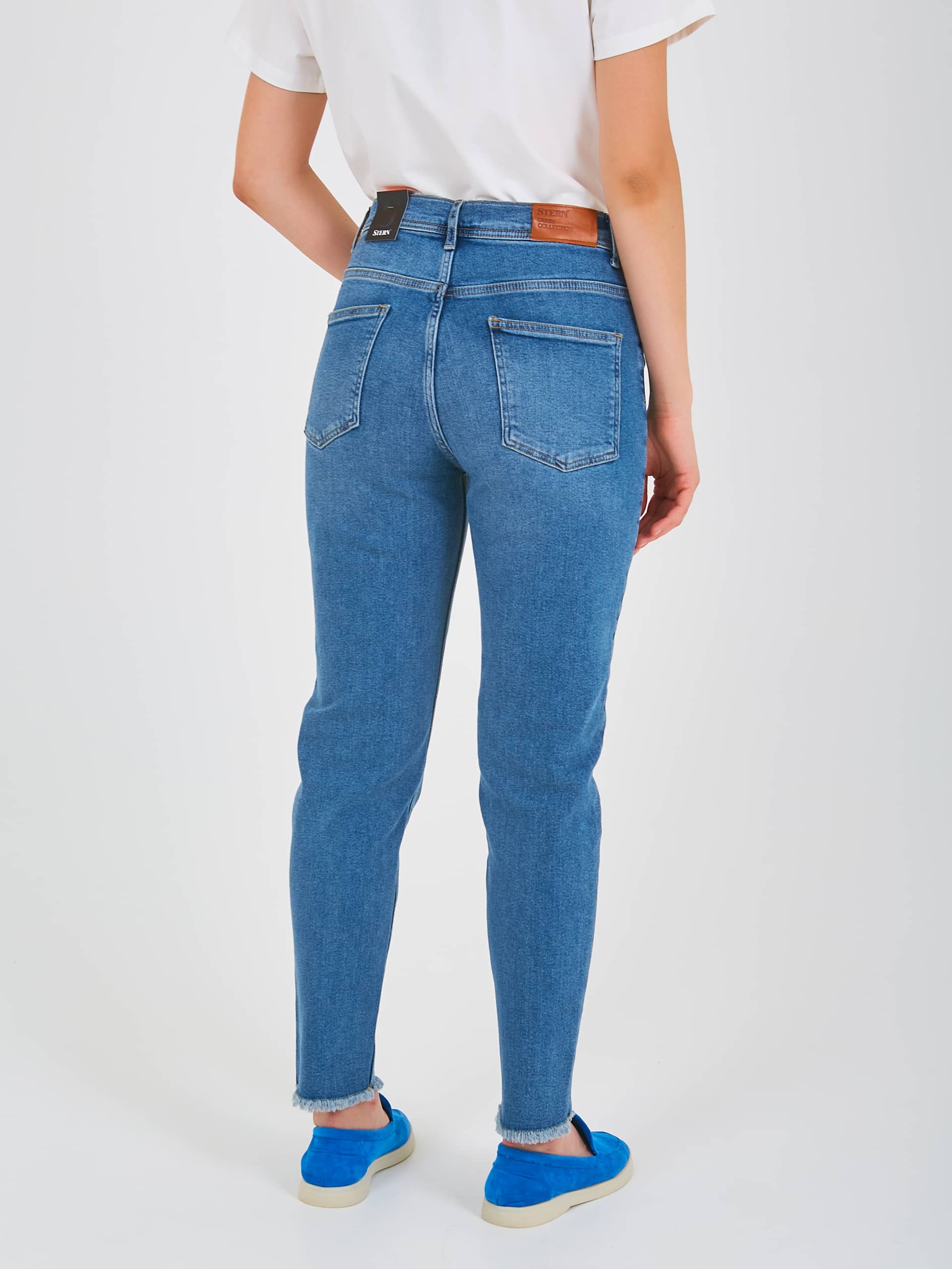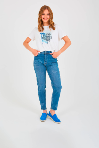 Джинсы «mom» длиной до щиколотки с застежкой на молнию и 1 пуговицу, дизайнерская особенность модели – на передних половинках цветочный принт с логотипом «Stern», вареный эффект и необработанный низ. Джинсы слегка зауженные книзу. На передних половинках расположены два кармана с отрезным бочком и один монетный карман. На задних половинках два накладных кармана и фигурная кокетка. Верх брюк обработан поясом со шлевками.