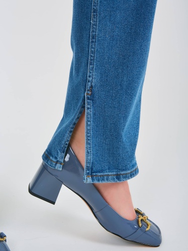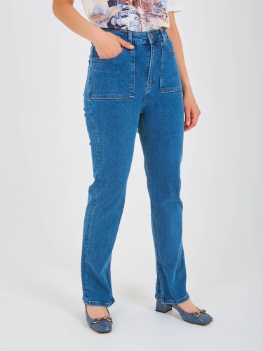Джинсы «Slim Fit», длина 7/8, с застежкой на молнию и 1 пуговицу. На передних половинках расположены два кармана с отрезным бочком – имитация накладных карманов. На задних половинках два накладных кармана и фигурная кокетка. Верх брюк обработан поясом со шлевками. Низ брюк с внутренними боковыми разрезами.