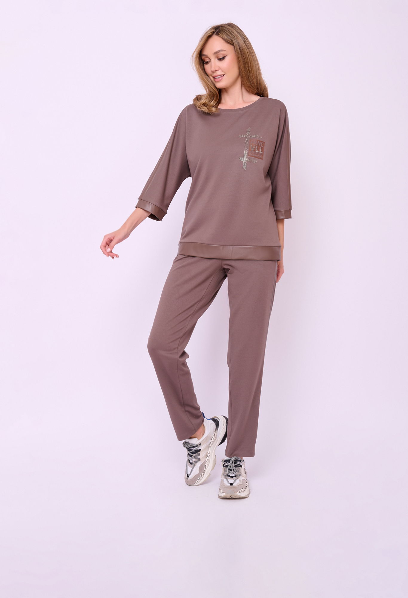 Трикотажные зауженные комфортные брюки на резинке и кулиске с косыми карманами и лампасами из искусственной кожи. Длина брючин: 79 см.