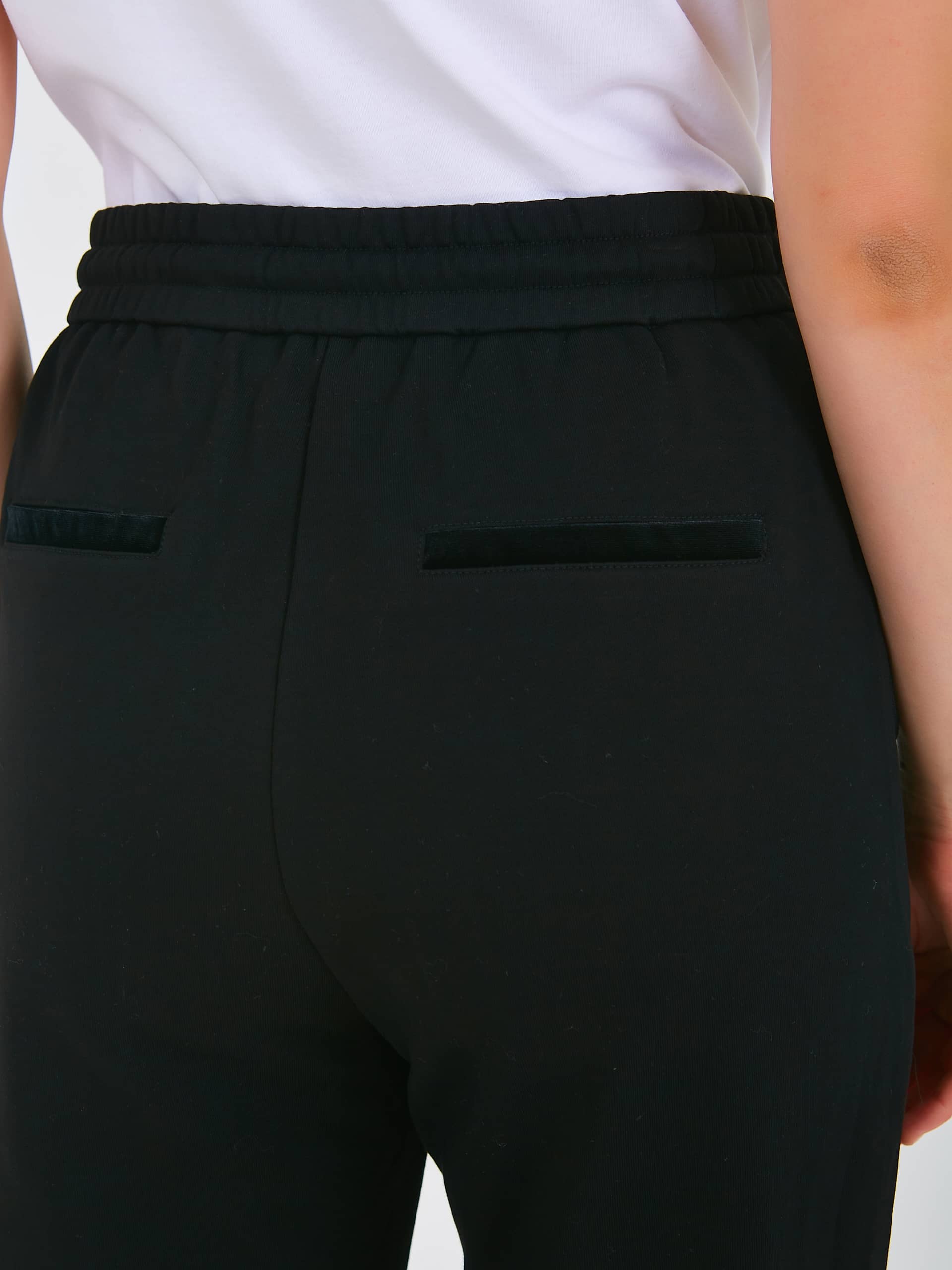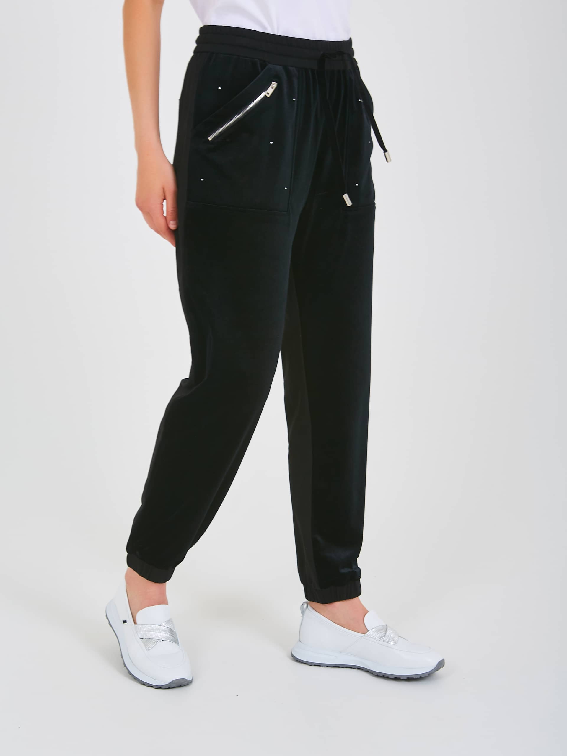 Спортивные брюки с завышенной талией длиной до щиколотки без застежки, дизайнерская особенность – использование двух разных по фактуре материалов, один из которых создает имитацию «звездного неба». На передних половинках расположены два кармана с отрезным бочком – имитация накладных карманов и декоративными молниями. На задних половинках брюк расположены карманы с листочкой. Верх брюк обработан поясом на резинке со шнуром для регулировки объема и металлическими наконечниками. Низ брюк присборен на манжету.