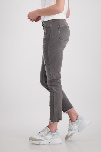 Джинсы узкого кроя имеют особые изюминки, такие как потрепанные детали со стразами и бахрома на отдельных манжетах. Высокое содержание хлопка и легкая эластичность гарантируют идеальную посадку. Длина внутренней штанины для всех размеров 70 см.