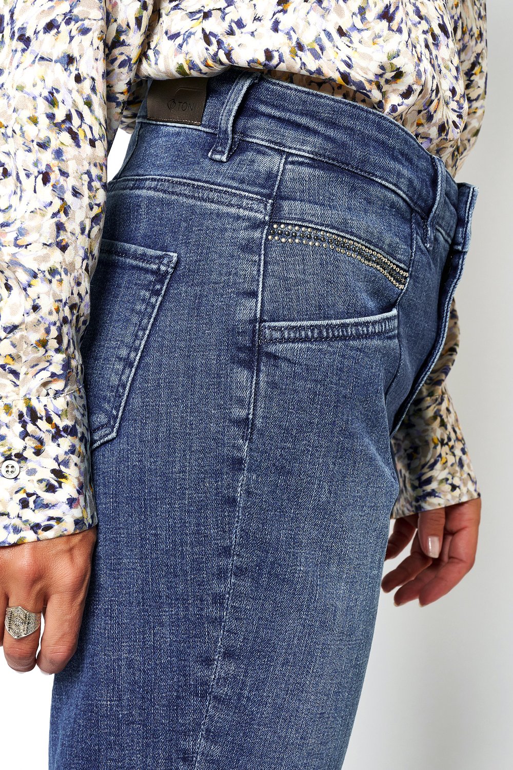 Джинсы прямого кроя с металлическими пластинами и вытачками в качестве деталей из стираного денима, слегка укороченной длины.