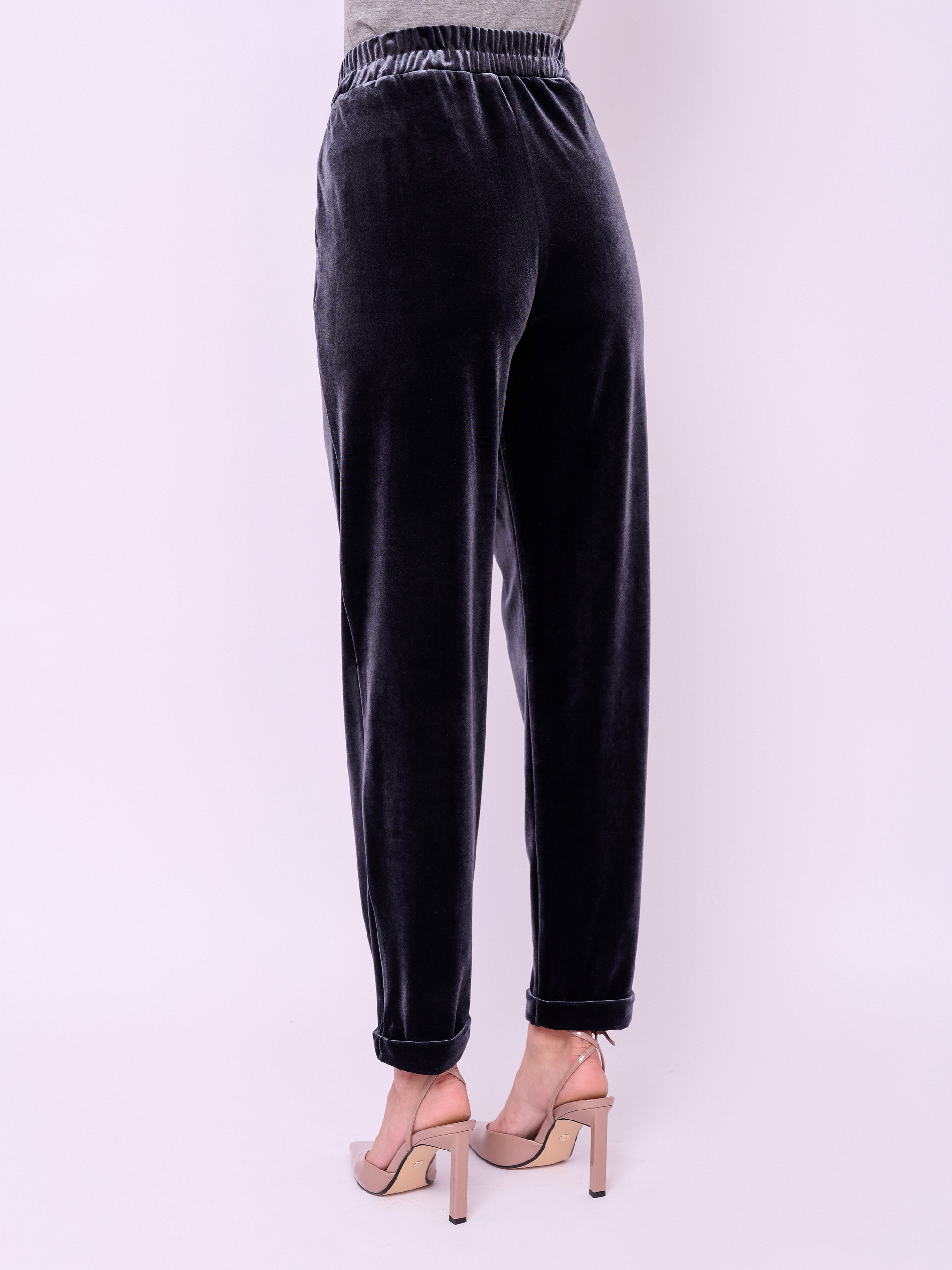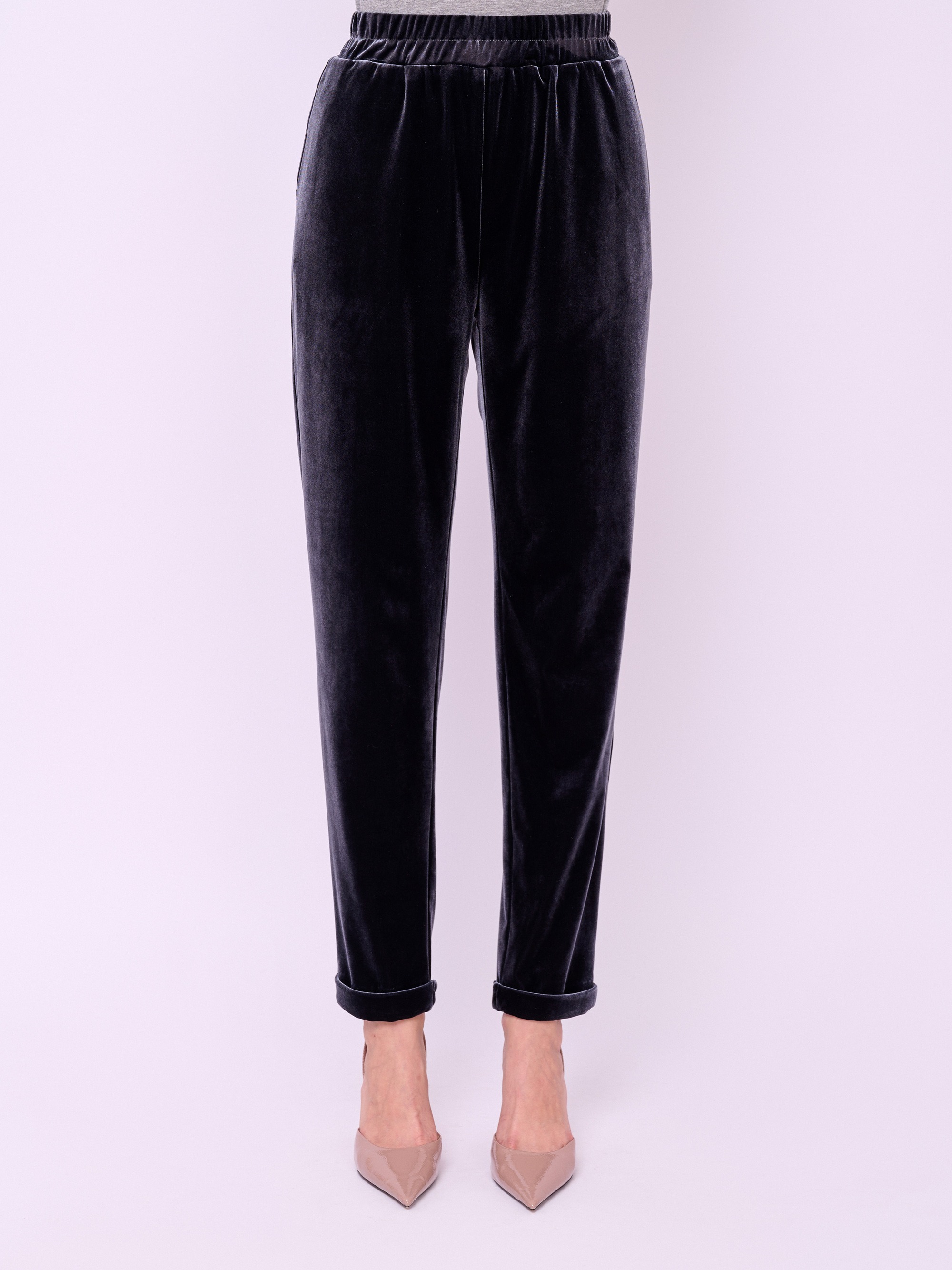 Трикотажные зауженные бархатные брюки на резинке с косыми карманами и отворотами по низу брючин. Длина брючин: 74 см.