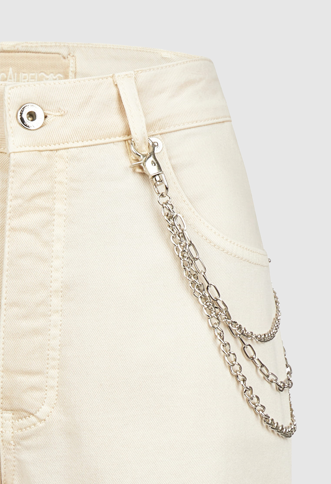 Брюки с высокой талией изготовлены из экологически чистой смеси хлопка и лиоцелла с добавлением стрейча. Свободный крой с широкими штанинами прекрасно дополняется открытым подолом, создавая непринужденный стиль. Серебряная съемная ювелирная цепочка также привлекает внимание.