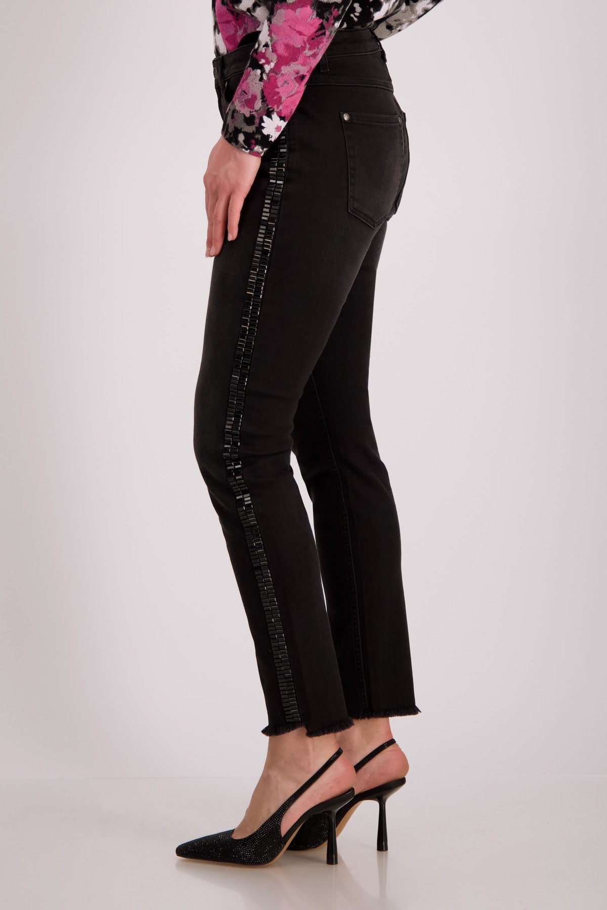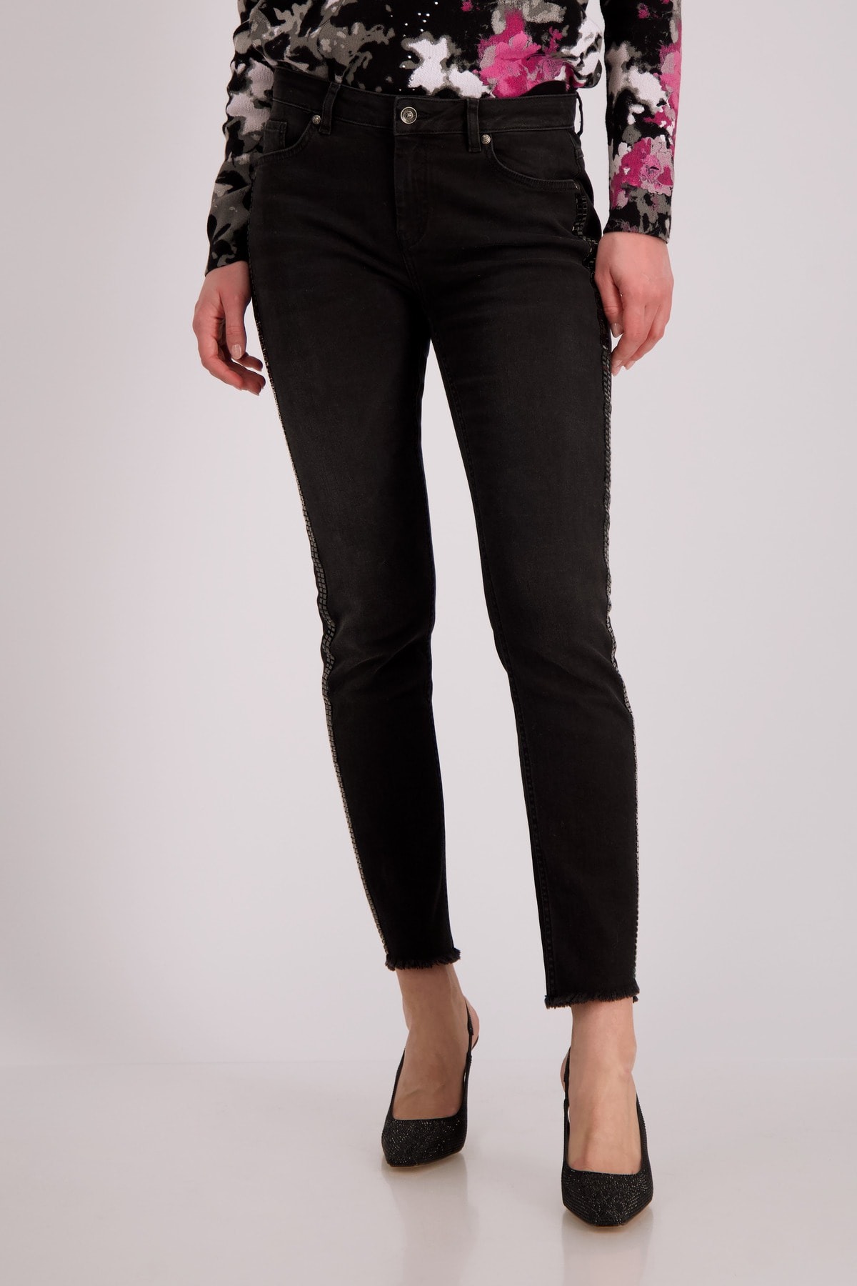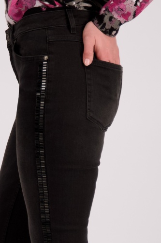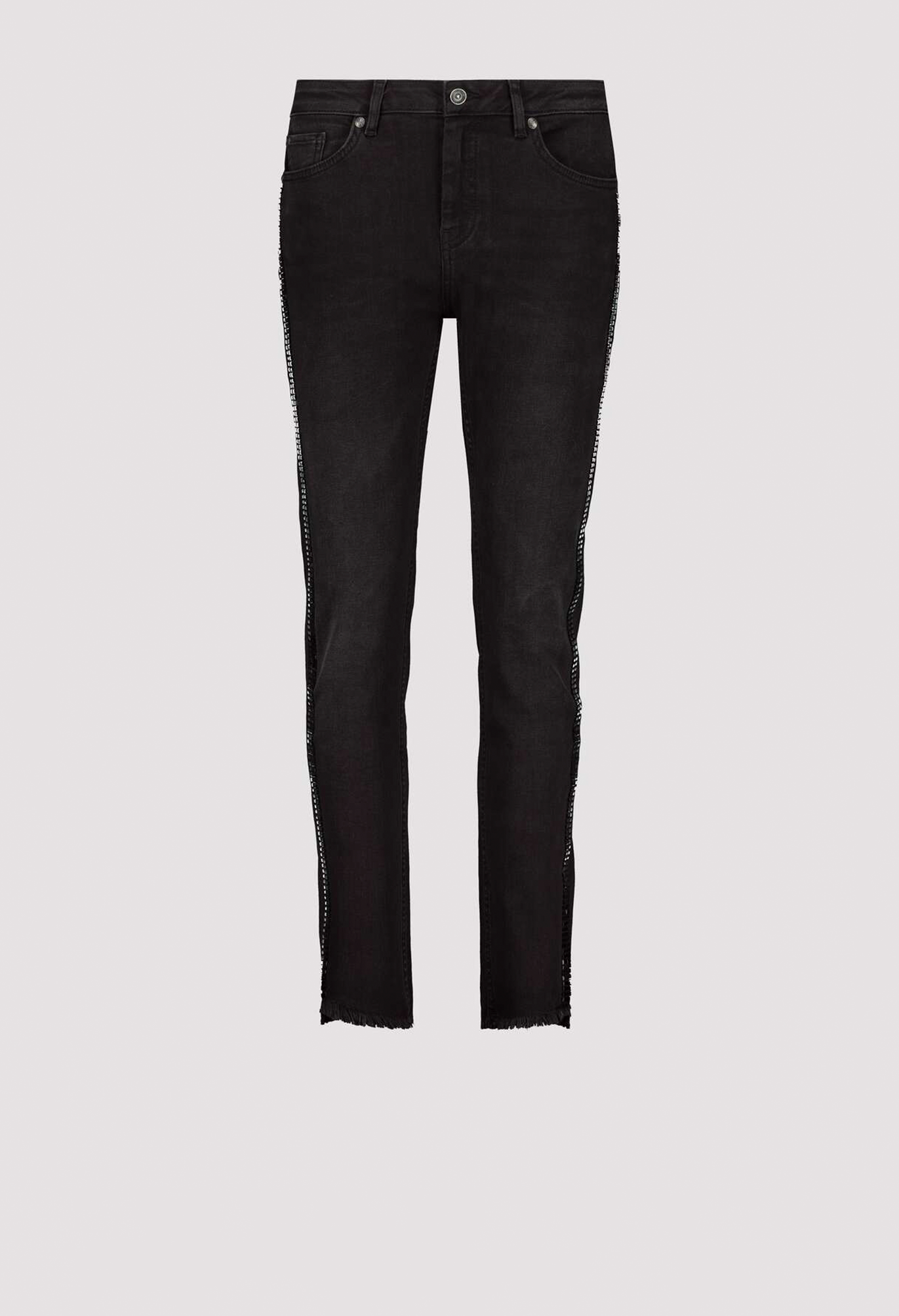 Джинсы приталенного кроя из эластичной смеси хлопка с максимальным комфортом. Боковины с тонированными заклепками. Бахрома на манжетах штанин. Тонкая посадка. Нормальная высота талии. 5-карманный стиль. Длина внутренней штанины для всех размеров составляет 74 см.