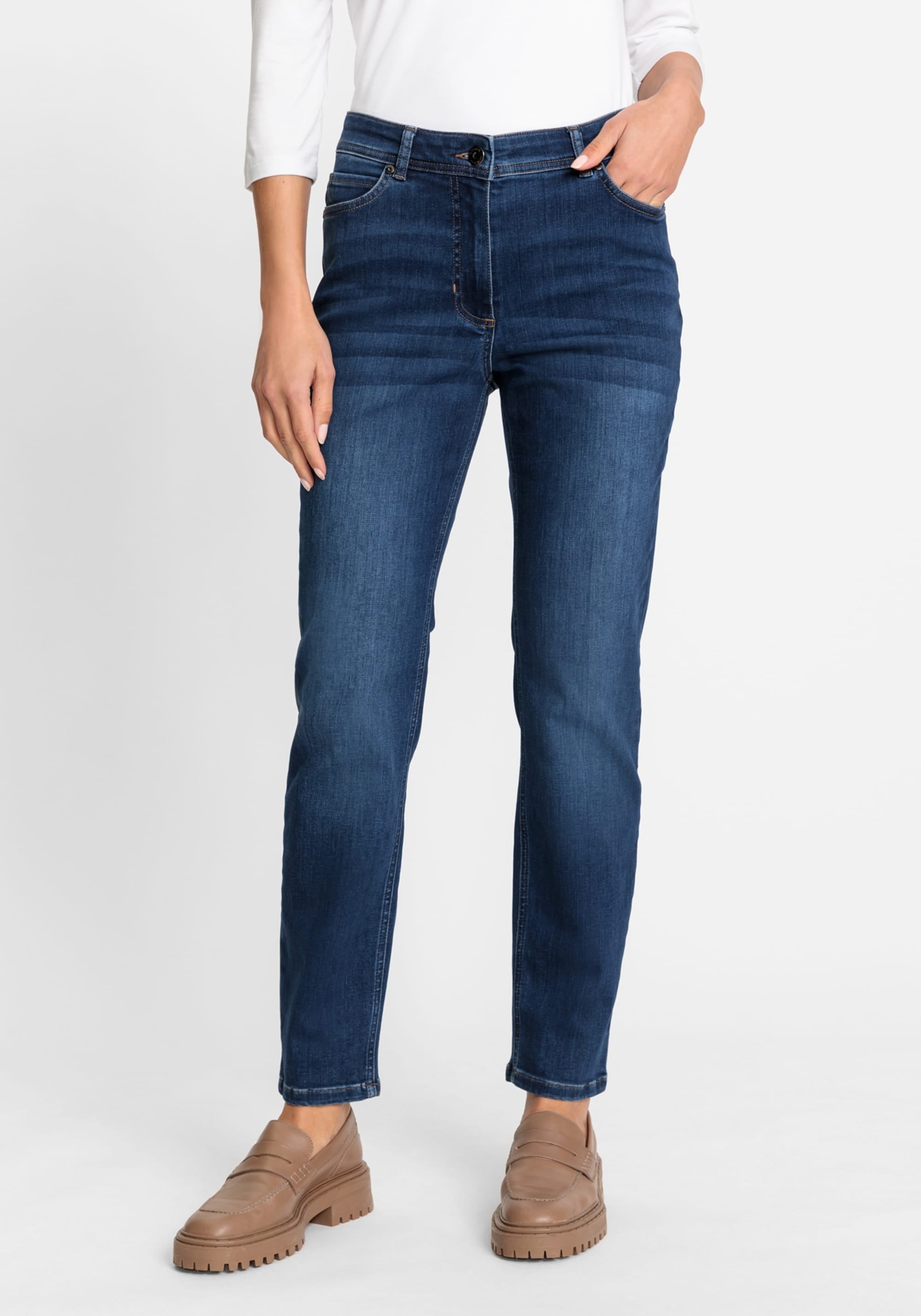 Джинсы из темного денима с легким эффектом стирки имеют классический джинсовый дизайн с пятью карманами и вышитыми задними карманами. Они сидят прямо на естественной линии талии, удлиняя ноги и обеспечивая свободную посадку в области бедер.