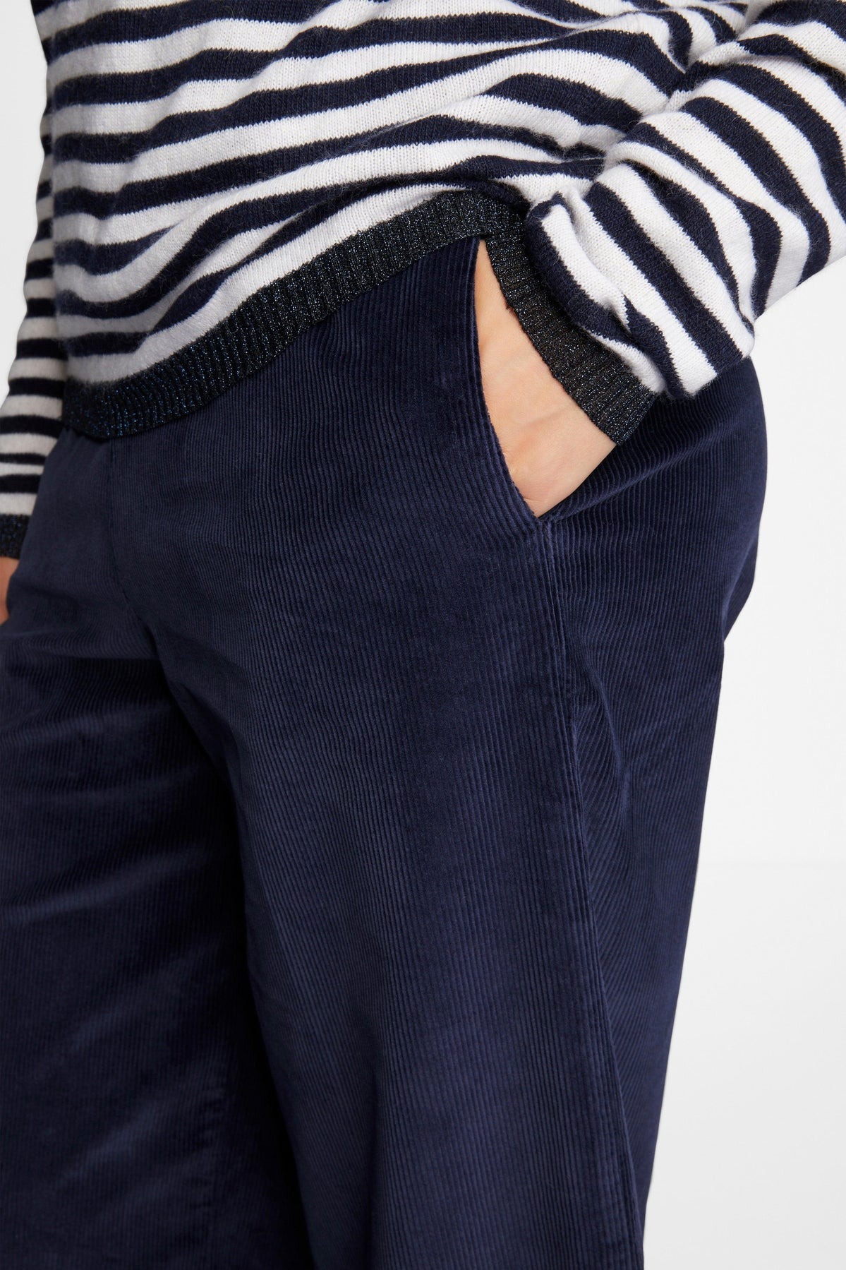 Вельветовые брюки-кюлоты изготовлены из смеси мягкого материала с добавлением хлопка и стрейча. Эластичный пояс подчеркивает комфорт при ношении. Длина для размера 42: 60 см.