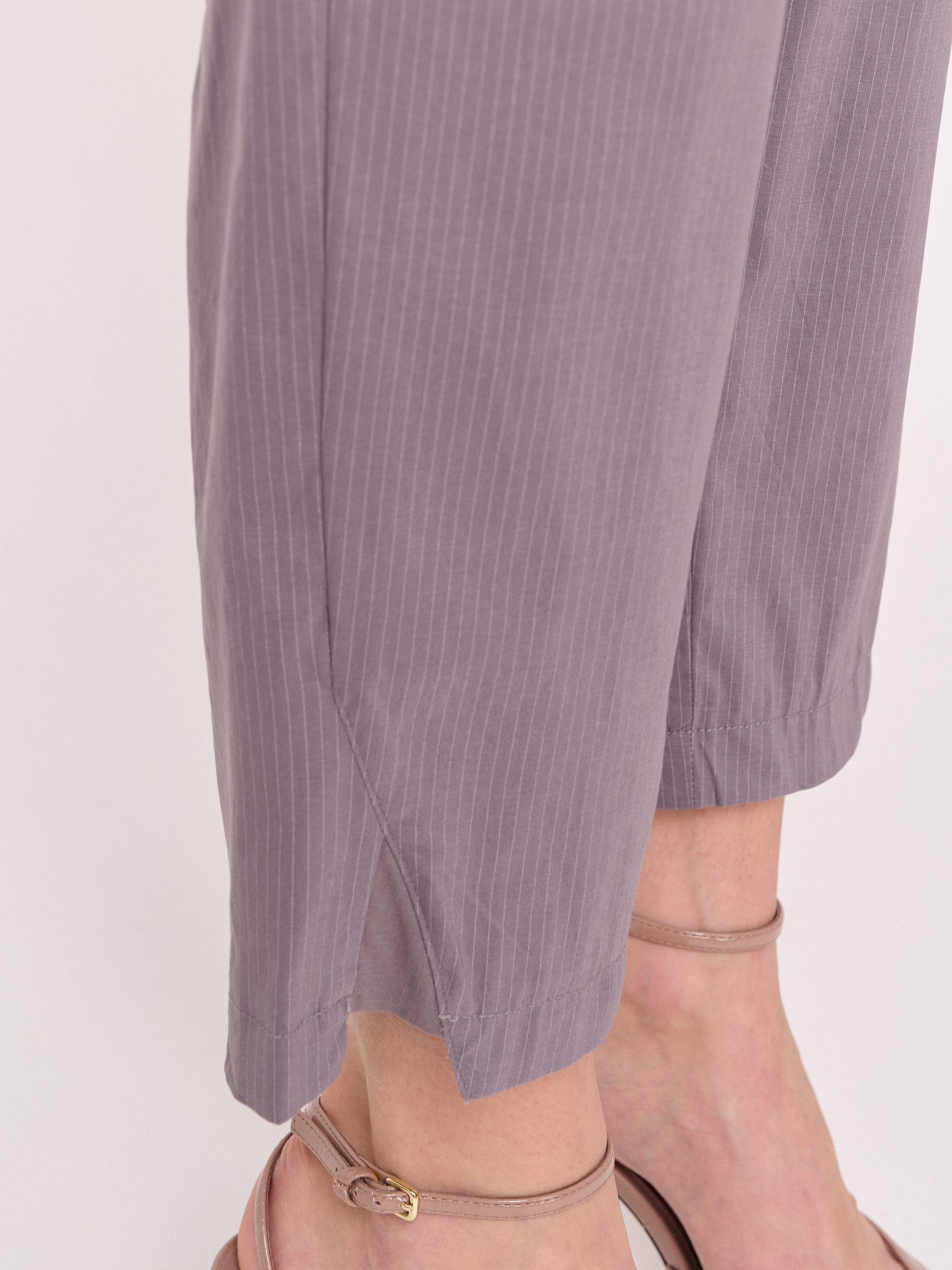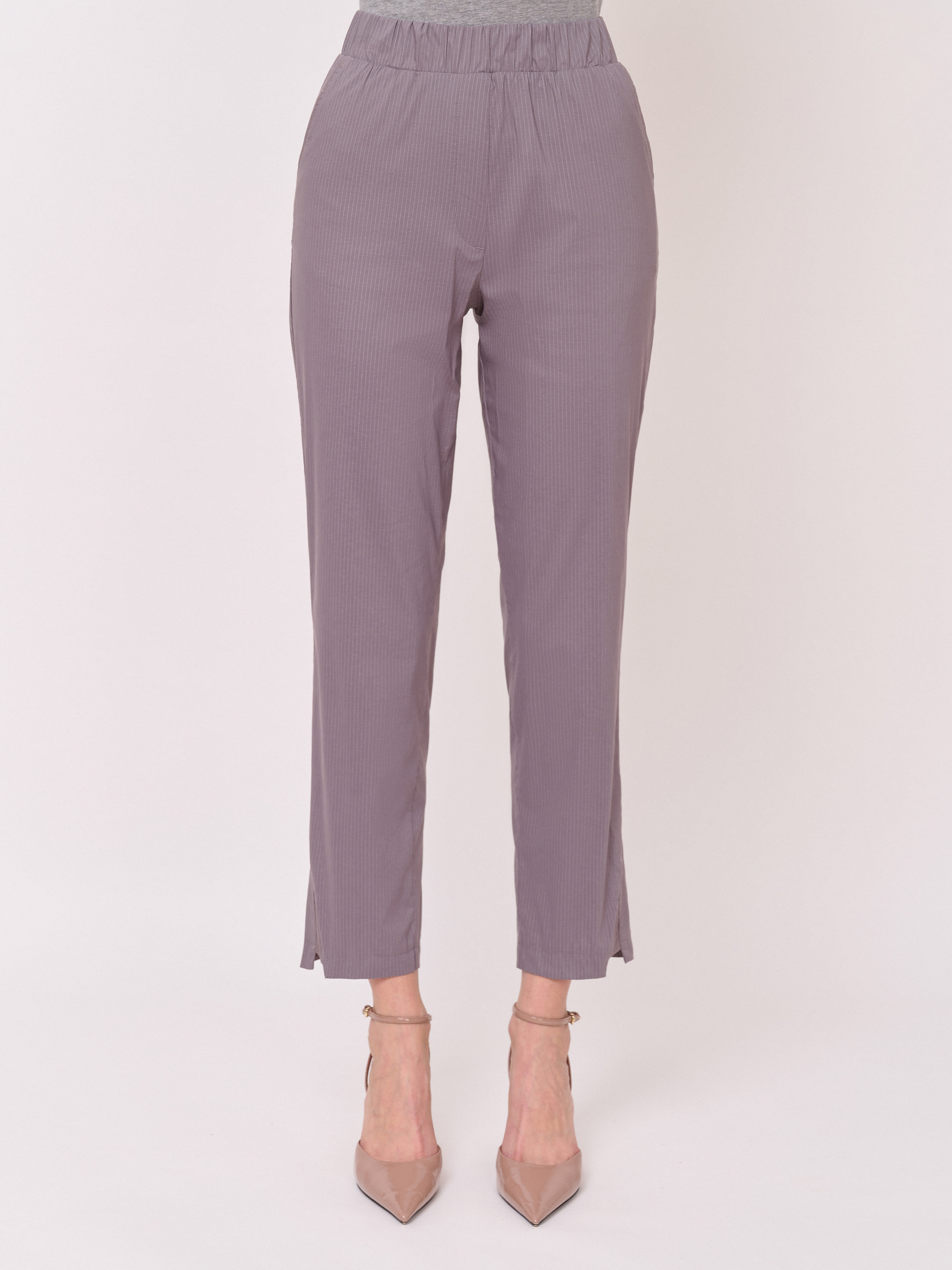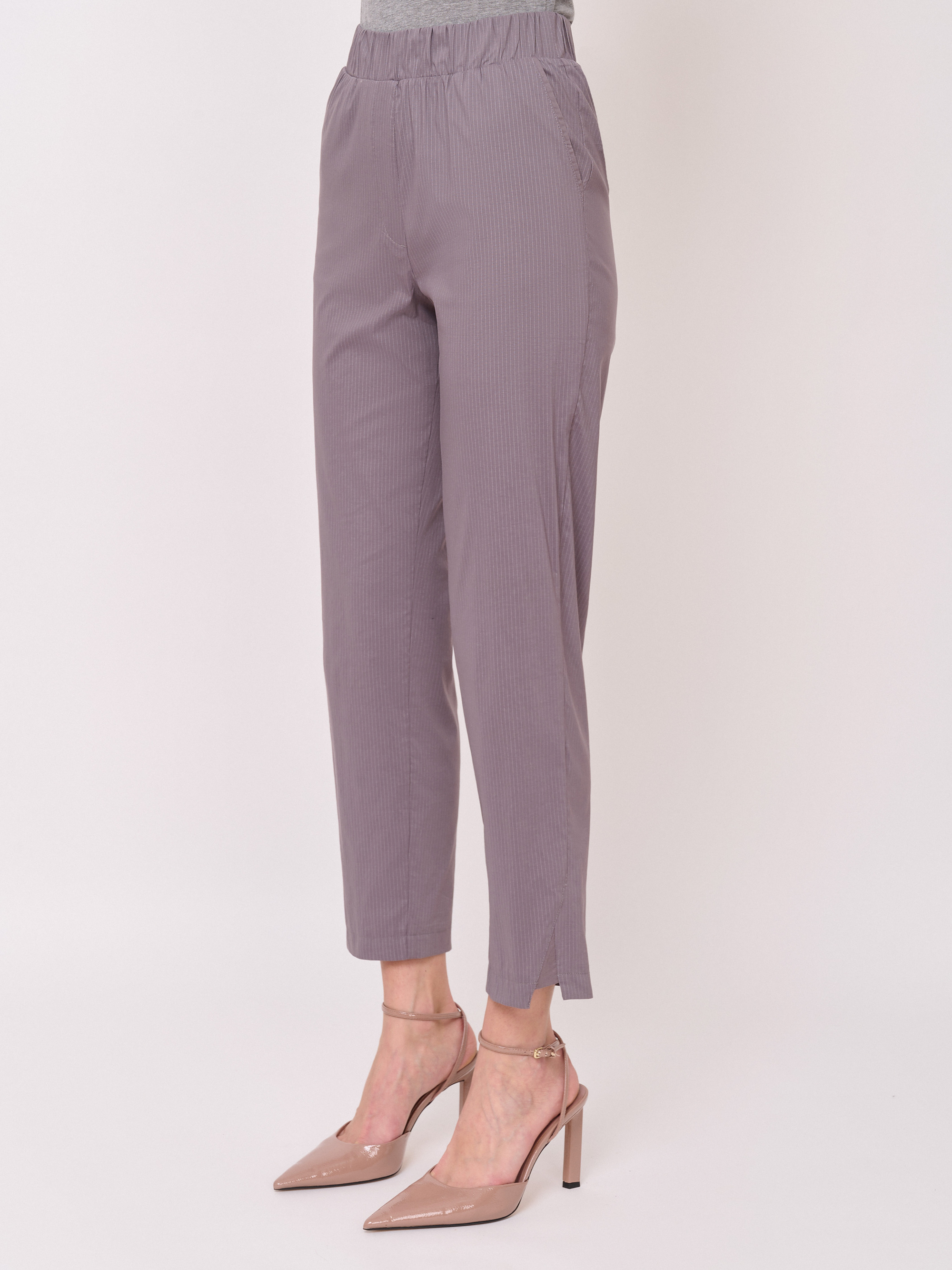 Детали: эластичный текстиль, пояс на резинке, рисунок полоска, карманы косые, крой брючин зауженный, посадка средняя. Длина брючин: 70 см.