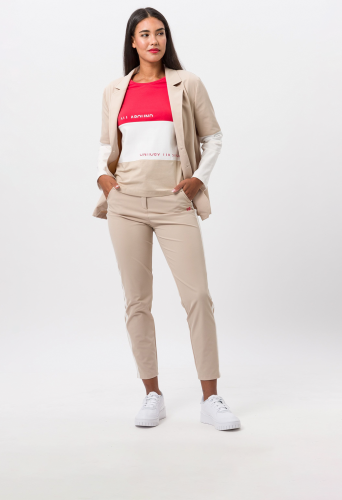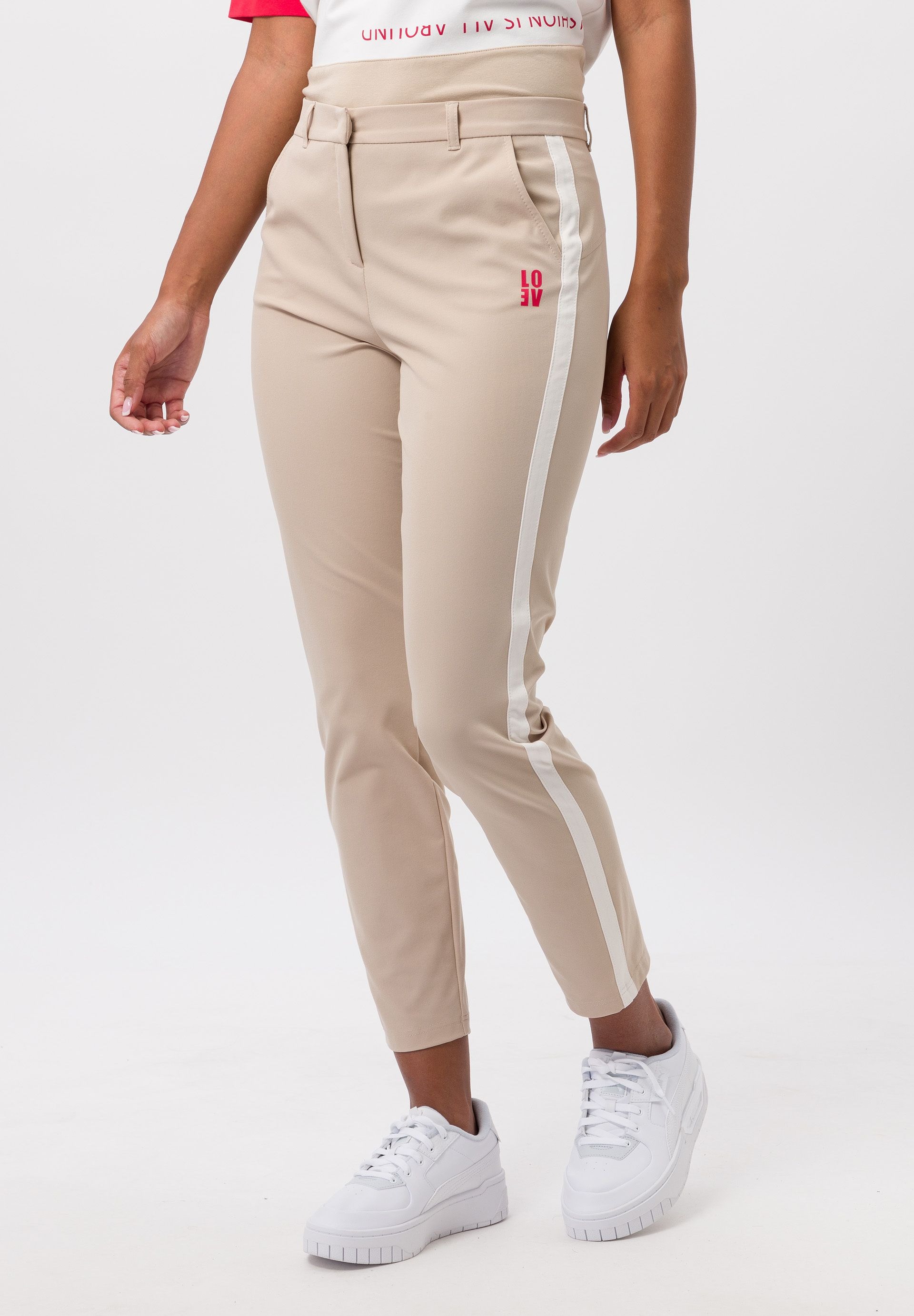 Брюки женские с контрастными полосками по бокам. Облегающий крой подчеркивает фигуру в сочетании с эластичной способностью сохранять форму. Это означает, что брюки очень удобно сидят на ноге в течение всего дня, сохраняя при этом свою форму. Потайная застежка на поясе с петлей для ремня обеспечивает чистоту спереди.