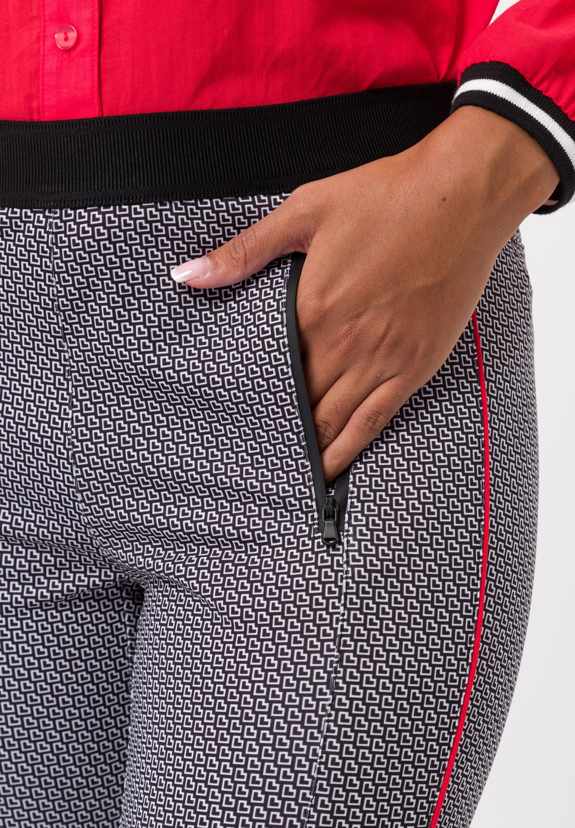 Брюки женские с контрастными полосками по бокам. Сочетание приятной эластичности, модного рисунка по всей поверхности, контрастных боковых полос, ламинированных карманов на молнии и контрастного эластичного пояса не оставит равнодушным ни одно модное сердце. Брюки этого классного дизайна незаменимы и станут изюминкой любого образа.