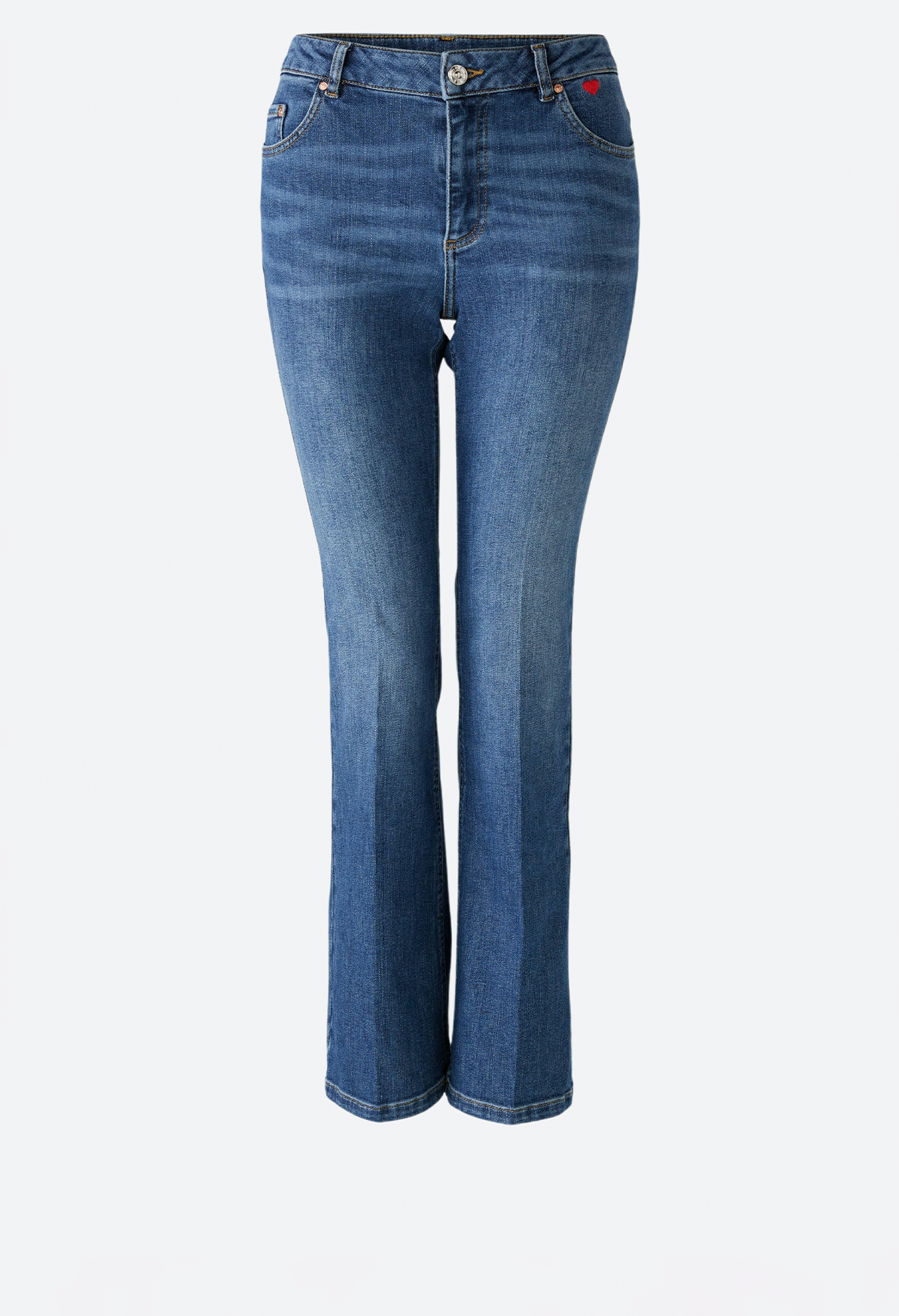 Эластичная смесь хлопка, аутентичная стирка среднего синего цвета. Средняя талия, стандартная длина, модный расклешенный крой. С молнией и пуговицей с логотипом, петлями для ремня. Типичные сумки с пятью карманами. Любимая деталь: маленькая вышивка в виде сердечек на сумке. Эластомультиэстер с превосходными свойствами растяжения и отскока. Длина для размера 36: 80 см.