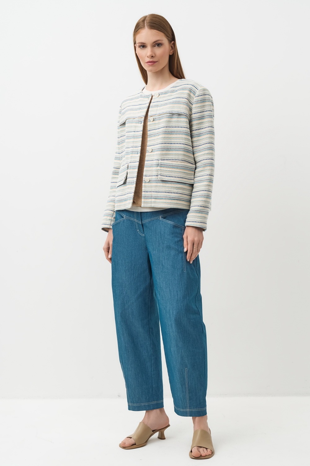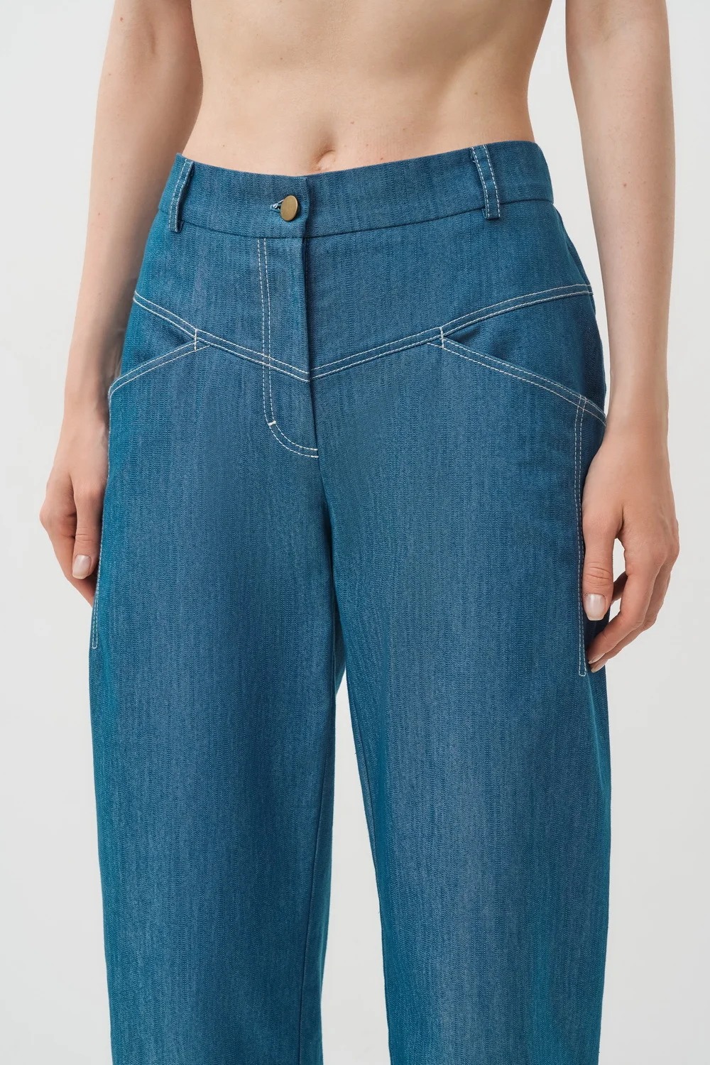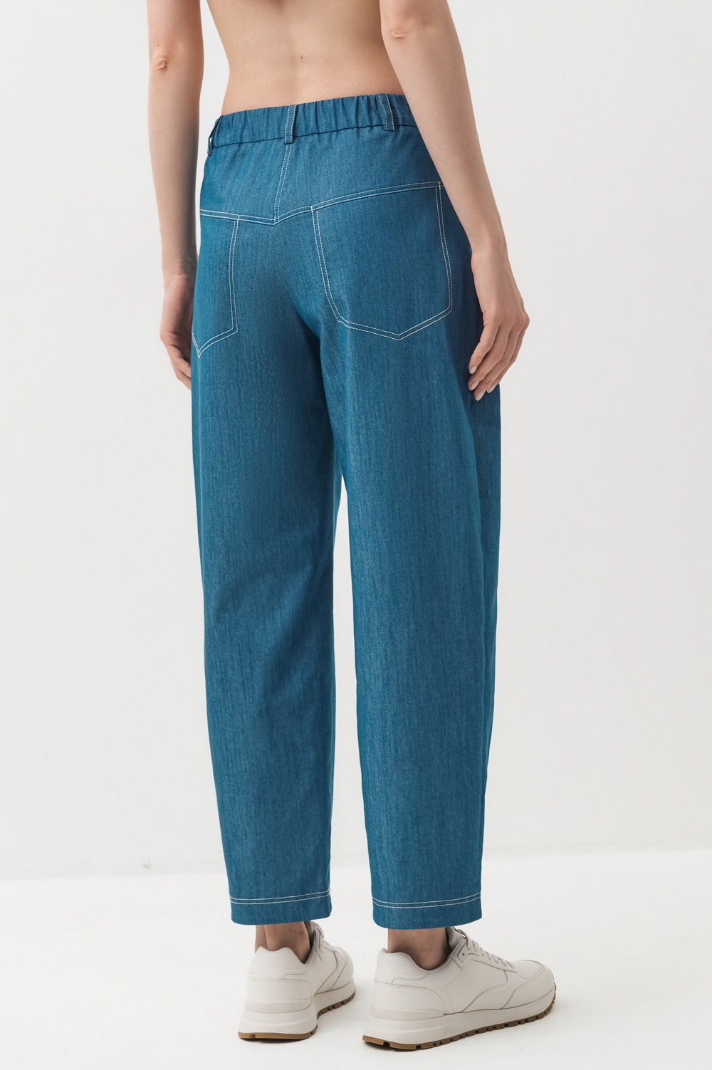 Брюки свободные по бедрам чуть заужены книзу с помощью вытачек. Пояс из двух частей, задняя часть собрана на резинку. Пять настрочных шлевок. Застежка гульфик на молнию, пояс- на кнопку-пуговицу (болт). Передняя половинка с кокеткой, разрезающей гульфик под углом. Боковой карман. Задняя половинка с заниженной кокеткой. Имитация задних карманов, выходящих из под кокетки, обозначена двойной отделочной строчкой контрастными нитками. Все отделочные строчки выполнены контрастными нитками.