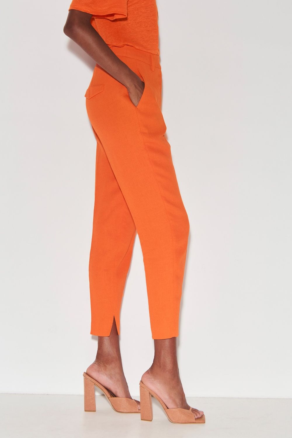 Слегка укороченные брюки из тонкой струящейся смесовой льняной ткани с узкими зауженными брючинами и приглаженными складками. Брюки имеют боковой разрез по низу, два боковых кармана и два декоративных набедренных кармана с клапанами.