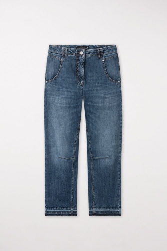 Укороченные джинсы свободного кроя из настоящего эластичного денима с оттенком синего цвета и винтажными эффектами. Слегка изогнутая форма штанин, разделительные швы на высоте колена и открытые края также характеризуют дизайн. Брюки очень удобны в носке благодаря использованию специальной эластомультиэфирной пряжи.